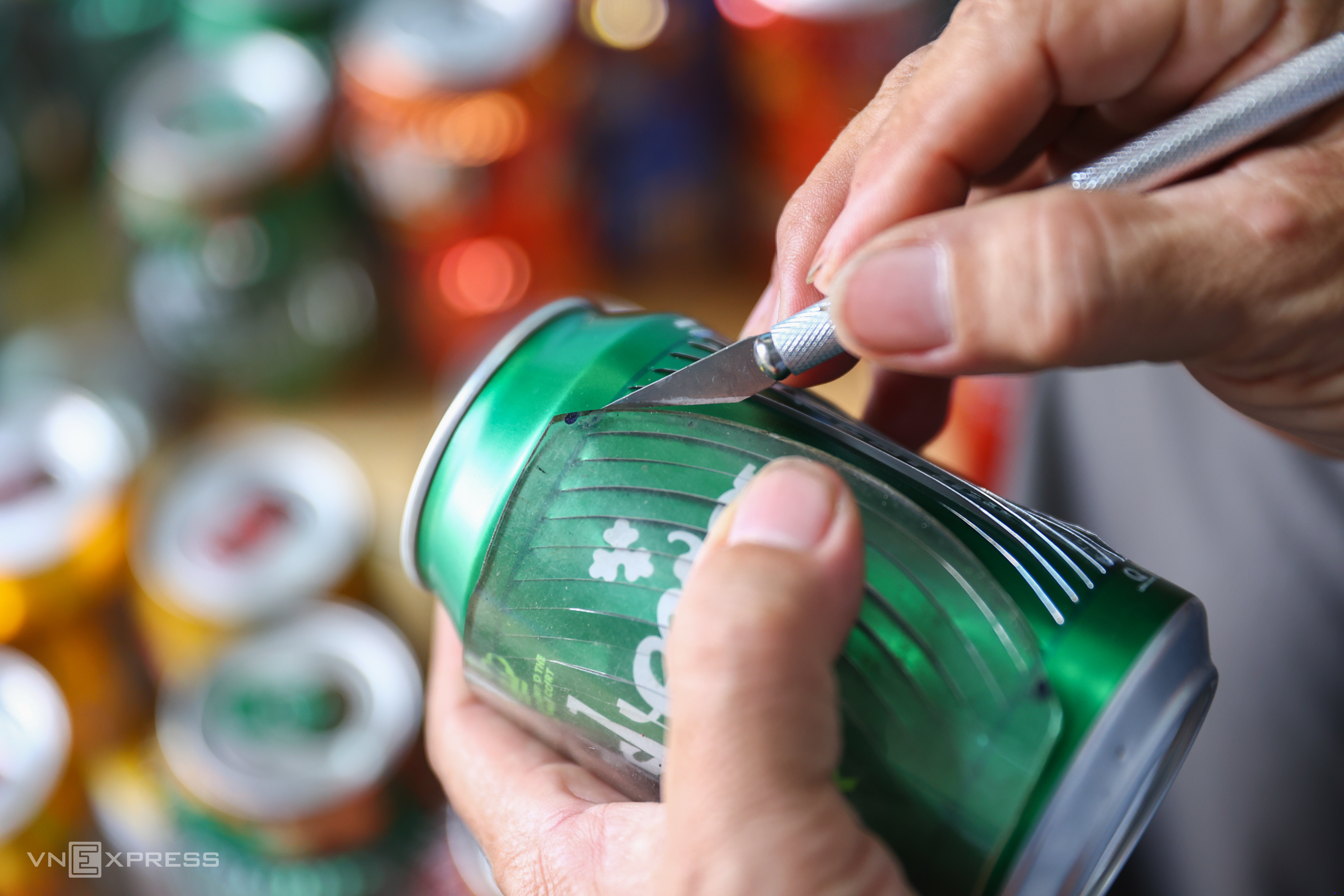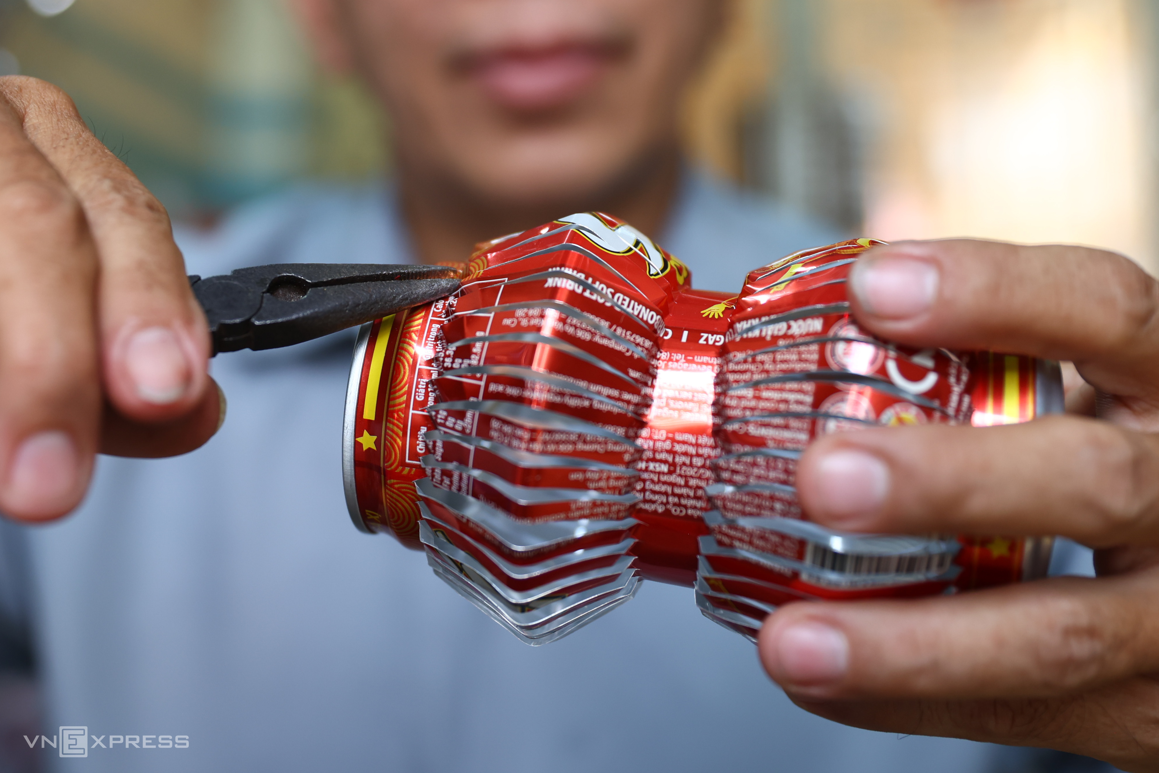 Undamaged, clean cans are scored, then shaped using pliers. It takes him about 15 minutes to shape each can. "This step is crucial because uneven cuts affect the aesthetics and quality of the product," Tuan said. |