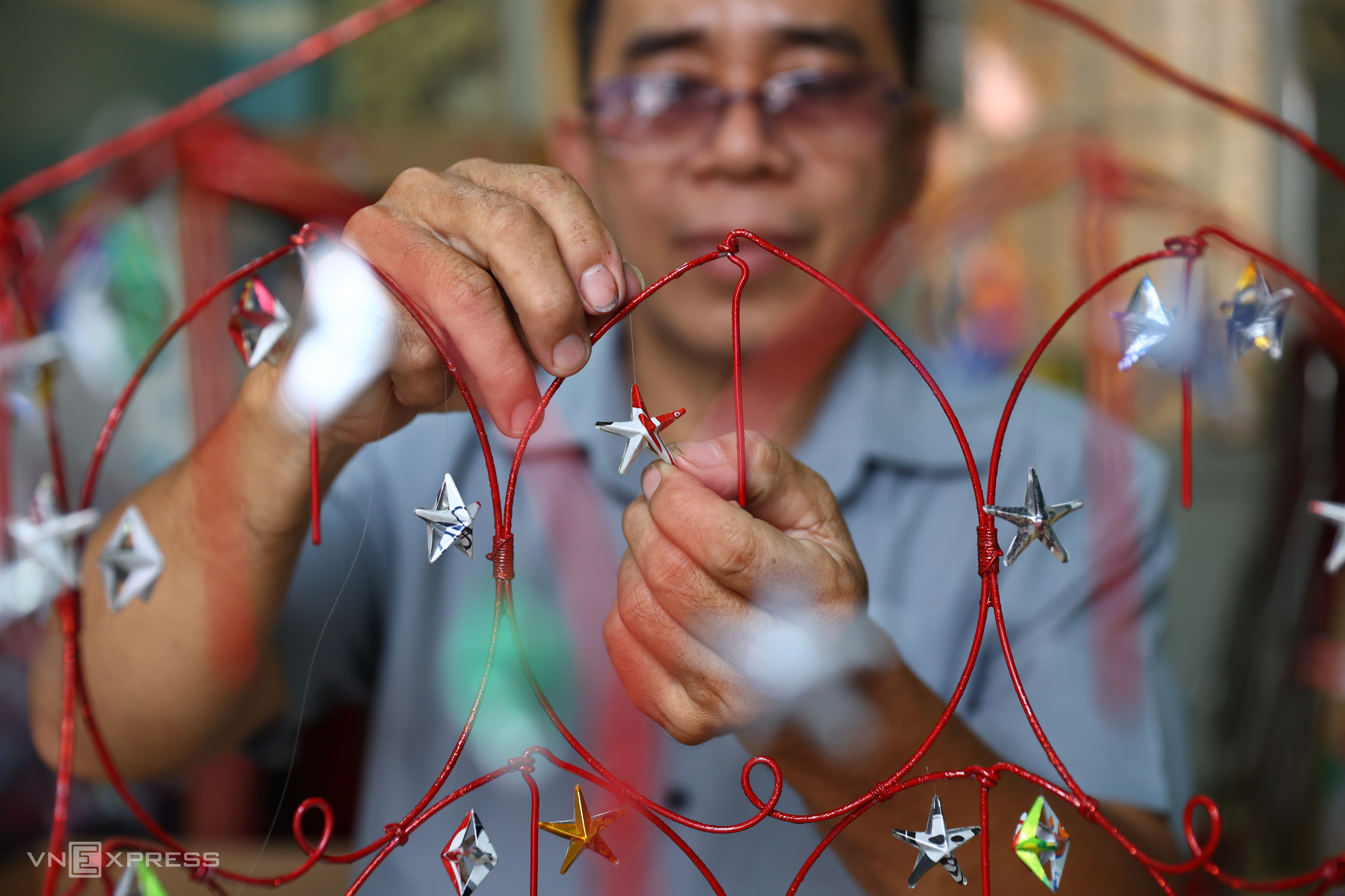 Tuan uses fishing line to attach the stars before affixing the cans to the frame. Depending on the size and complexity, each lantern takes several hours to two weeks to complete. |