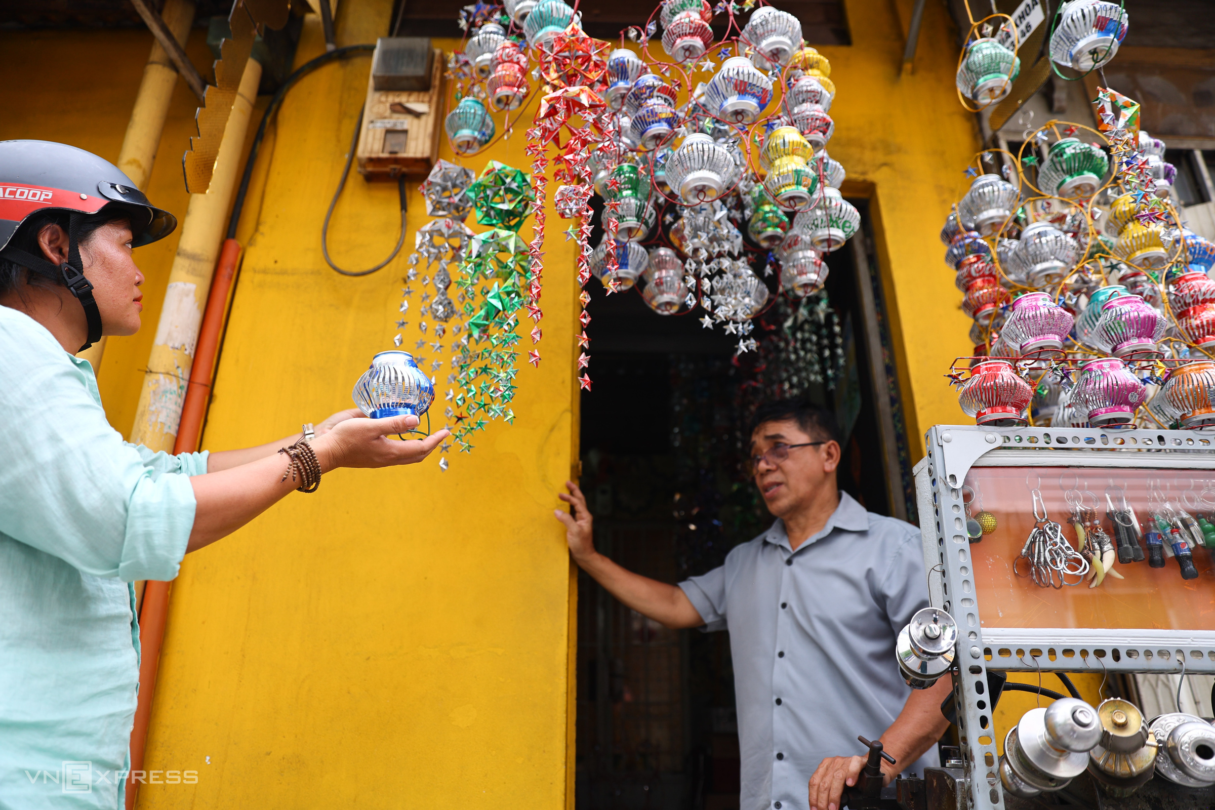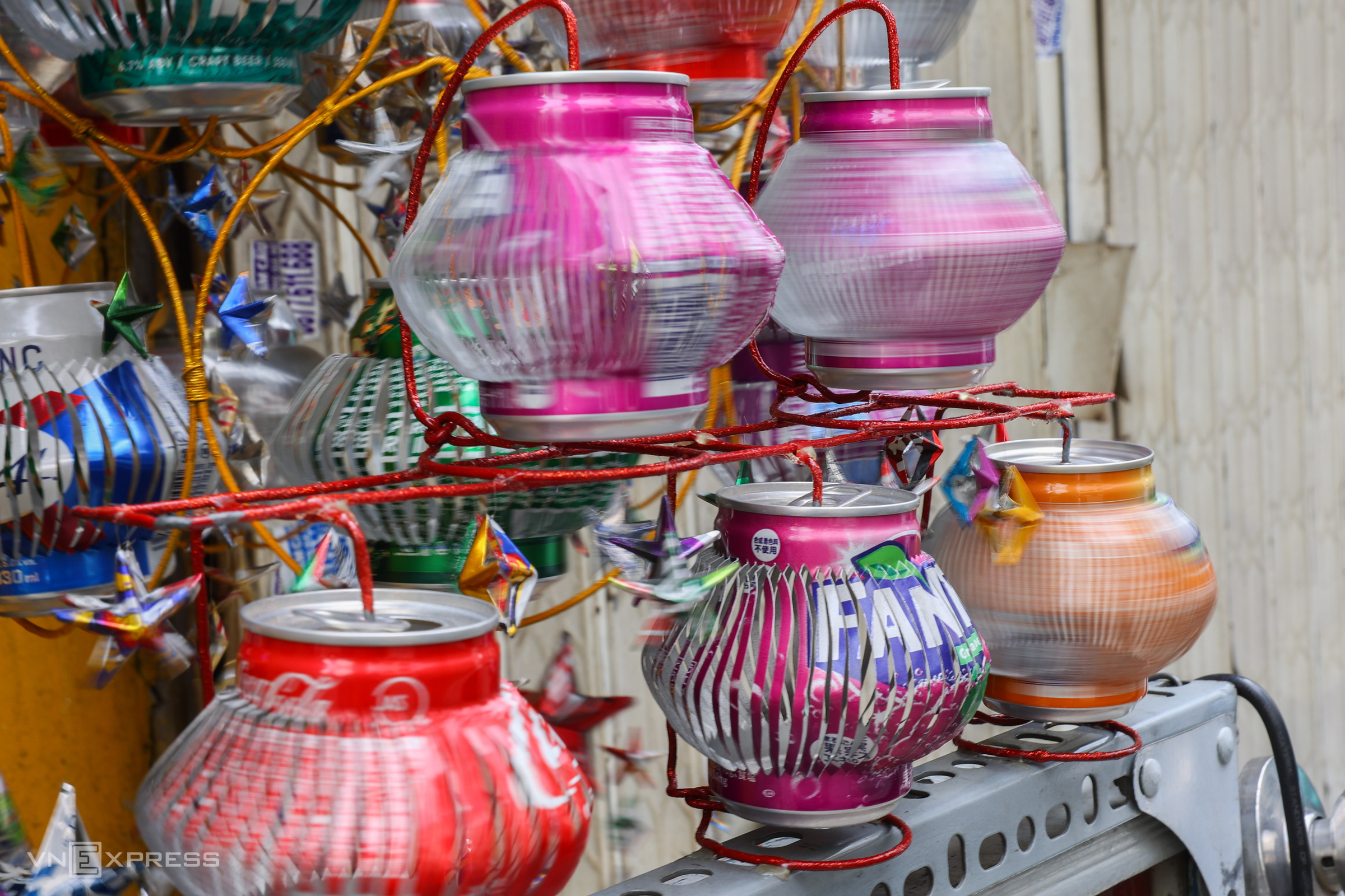 The most popular are the single-can lanterns, priced at about 40,000 VND. "Customers buy them not only for the festival but also as home decorations. When there's a breeze, the spinning cans create a captivating visual effect," he shared. |