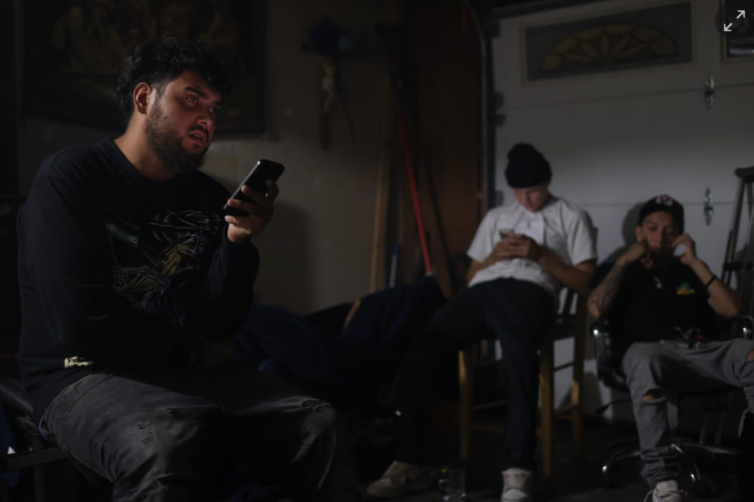 Daniel (left) and friends often gather in the family garage to ensure safety. *Photo: Arielle Domb/The Guardian* |