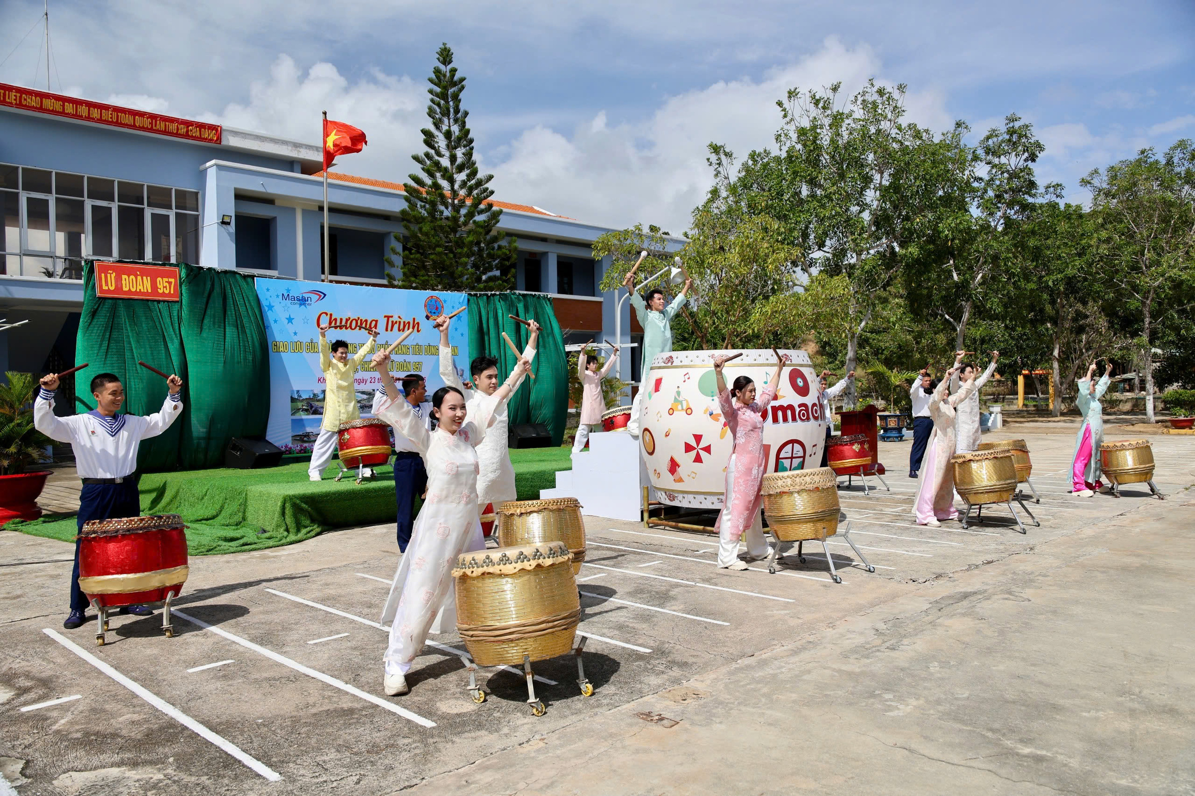 Beyond providing practical products, the brand also offered a spiritual gift: a synchronized "Tieng trong hoi xuan" drum performance, creating a meaningful moment for the soldiers. The performance featured soldiers from Brigade 957 alongside artists, fostering a direct connection and interaction between the military and civilians.