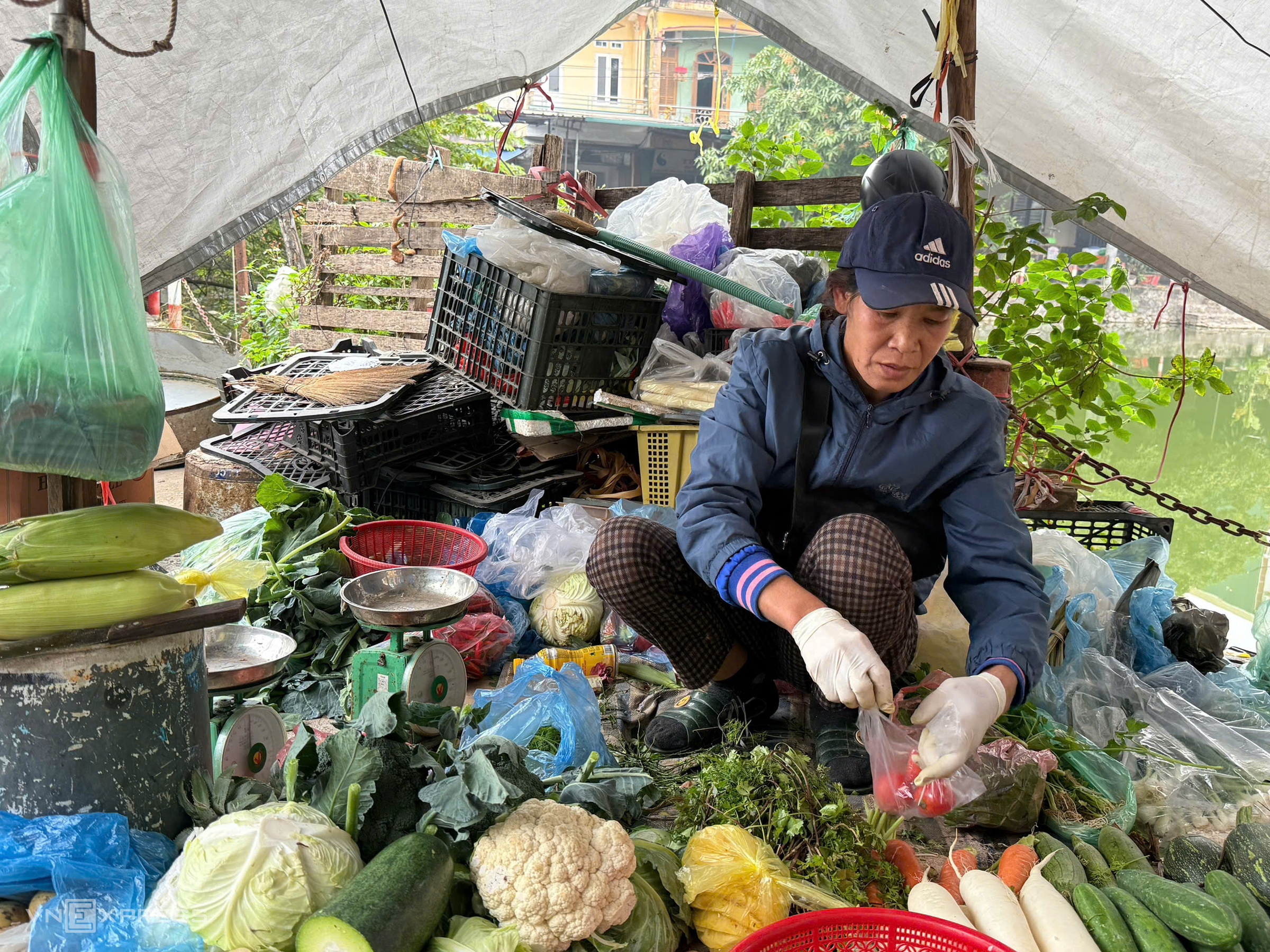 Ms. Hoang Thi Hoa, 51, selling vegetables at the market in Van Diem village, Phu Xuyen, early 1/2026. Photo: Quynh Nguyen
