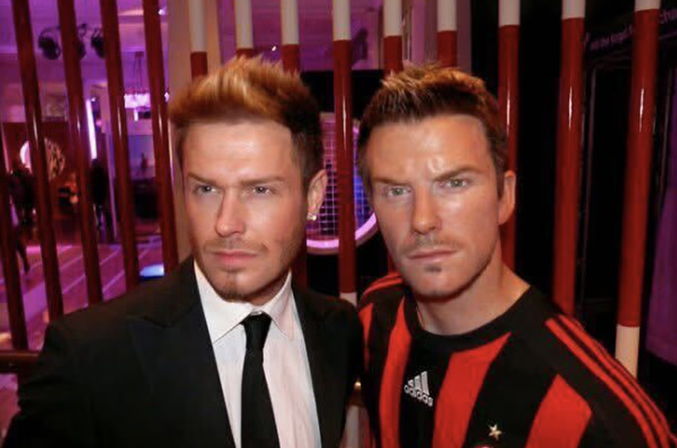Andy Harmer (left) next to a wax figure of David Beckham in England. Photo: *Andy Harmer* |