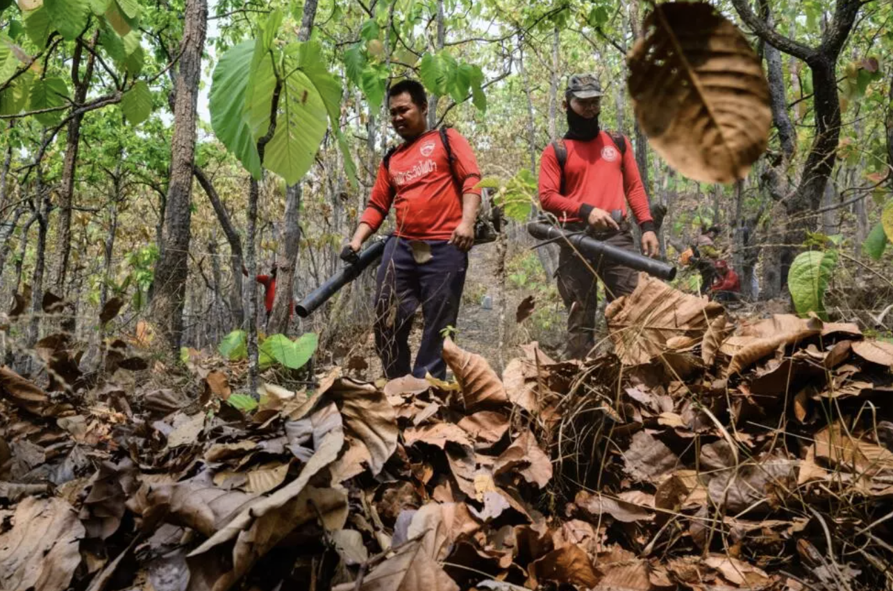 Volunteer firefighters use leaf blowers to create firebreaks in a forest in Pai town, northern Thailand, early April. Photo: ANTHONY WALLACE/AFP |