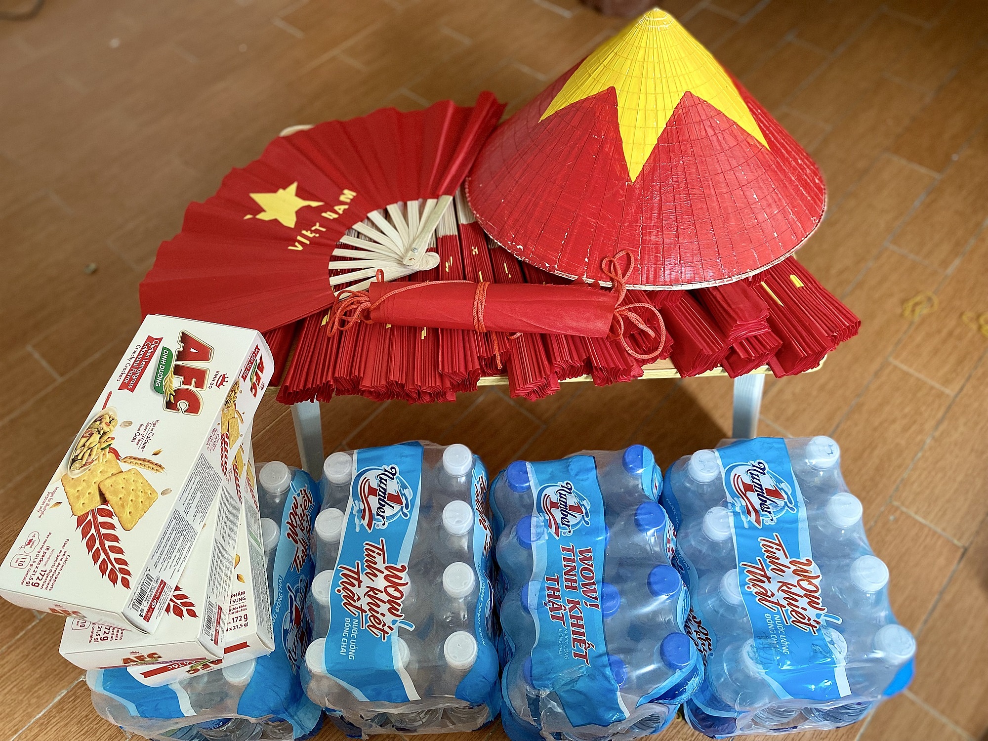 Hats, string flags, fans, along with cakes and water, are packed by Thu Thuy and her 8-year-old daughter in Dong Da ward on the afternoon of 3/9, ready to be sent to highland children. Photo: Provided by the subject. |