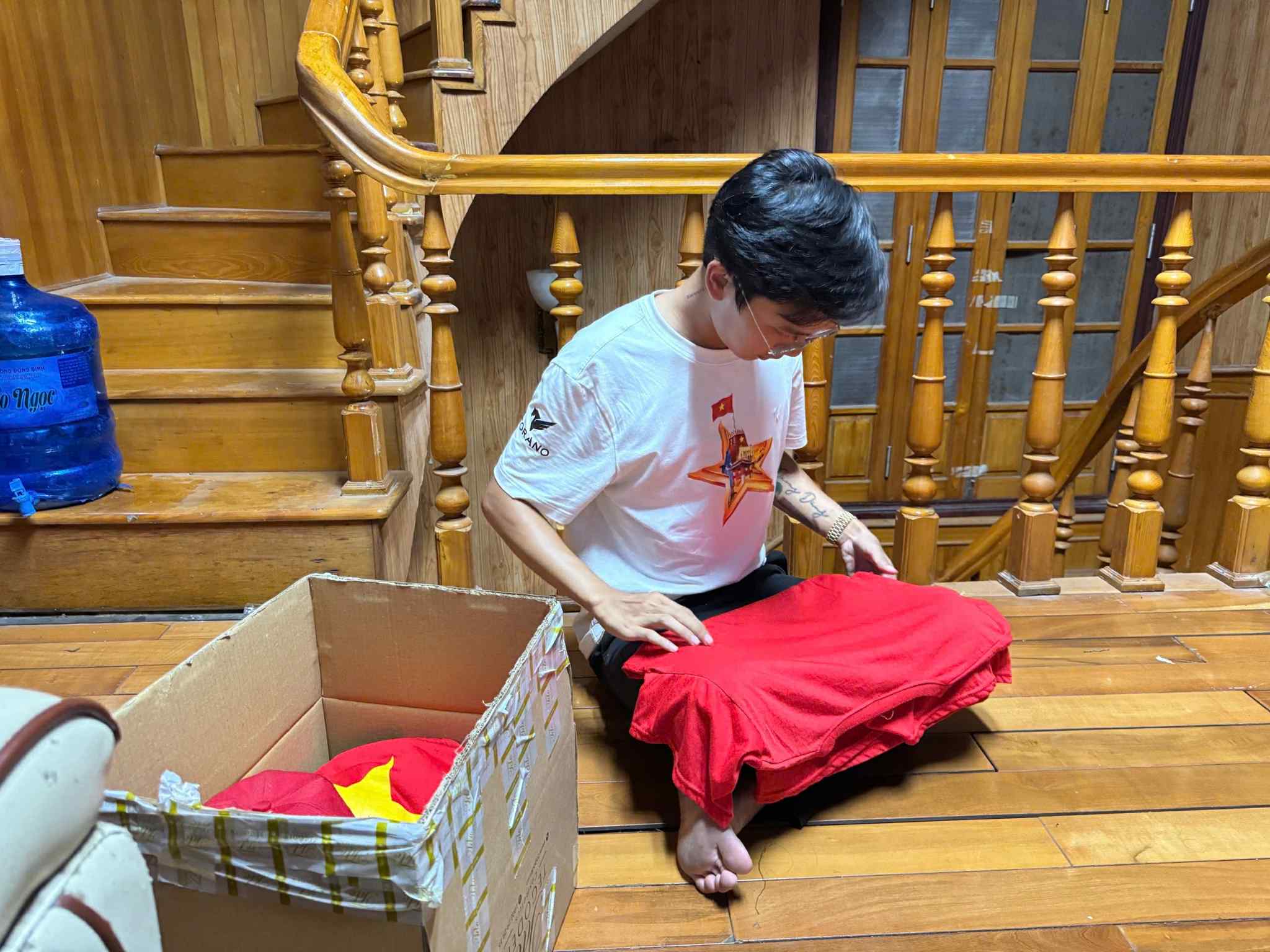 Hoang Dung folds shirts printed with the national flag, preparing to pack and send them to students at Ha Giang Ethnic Boarding High School in Tuyen Quang province, on the afternoon of 3/9. Photo: Provided by the subject. |