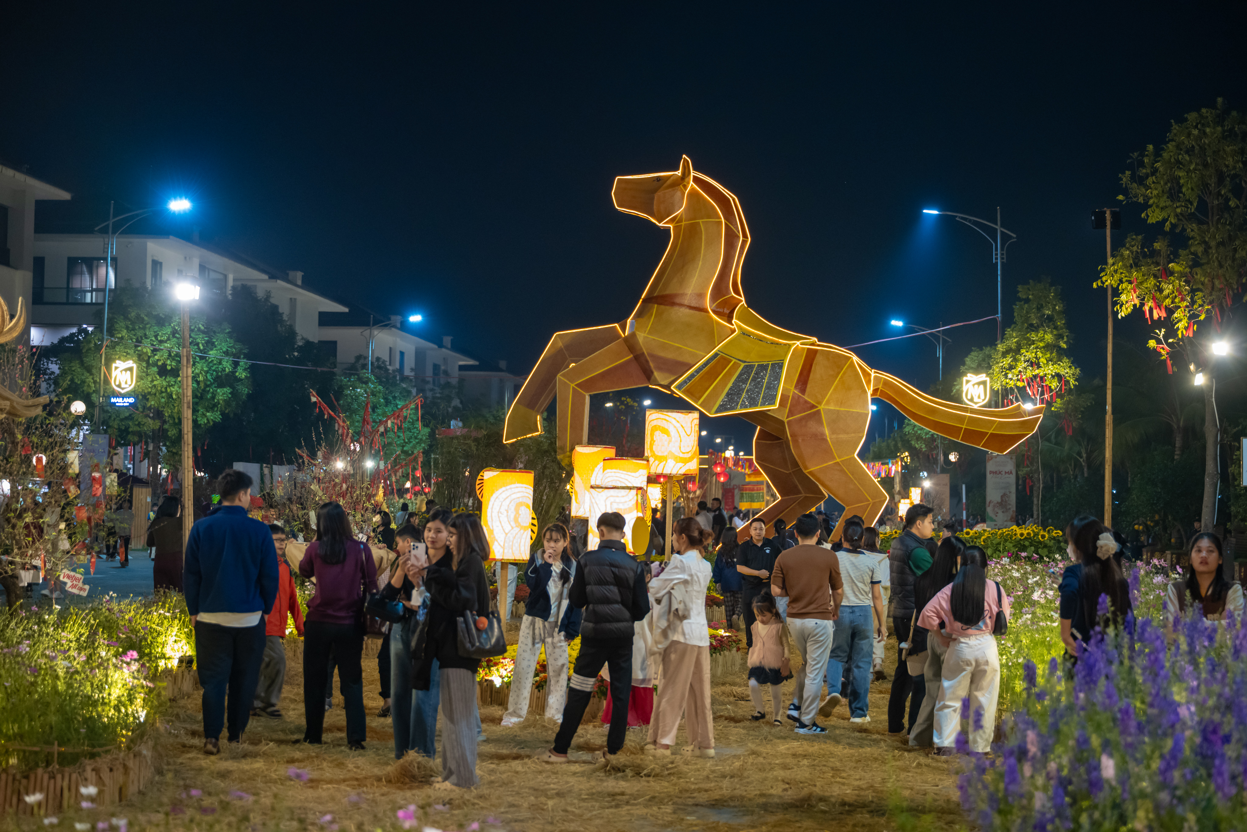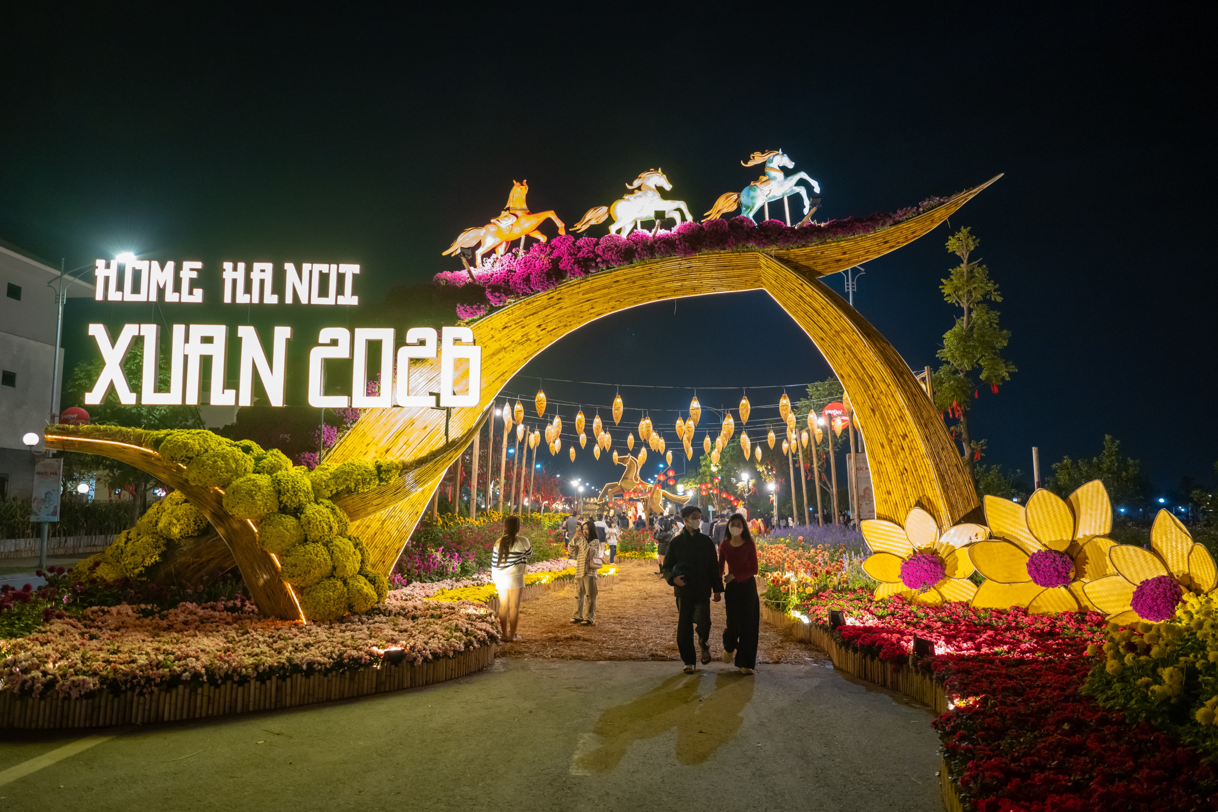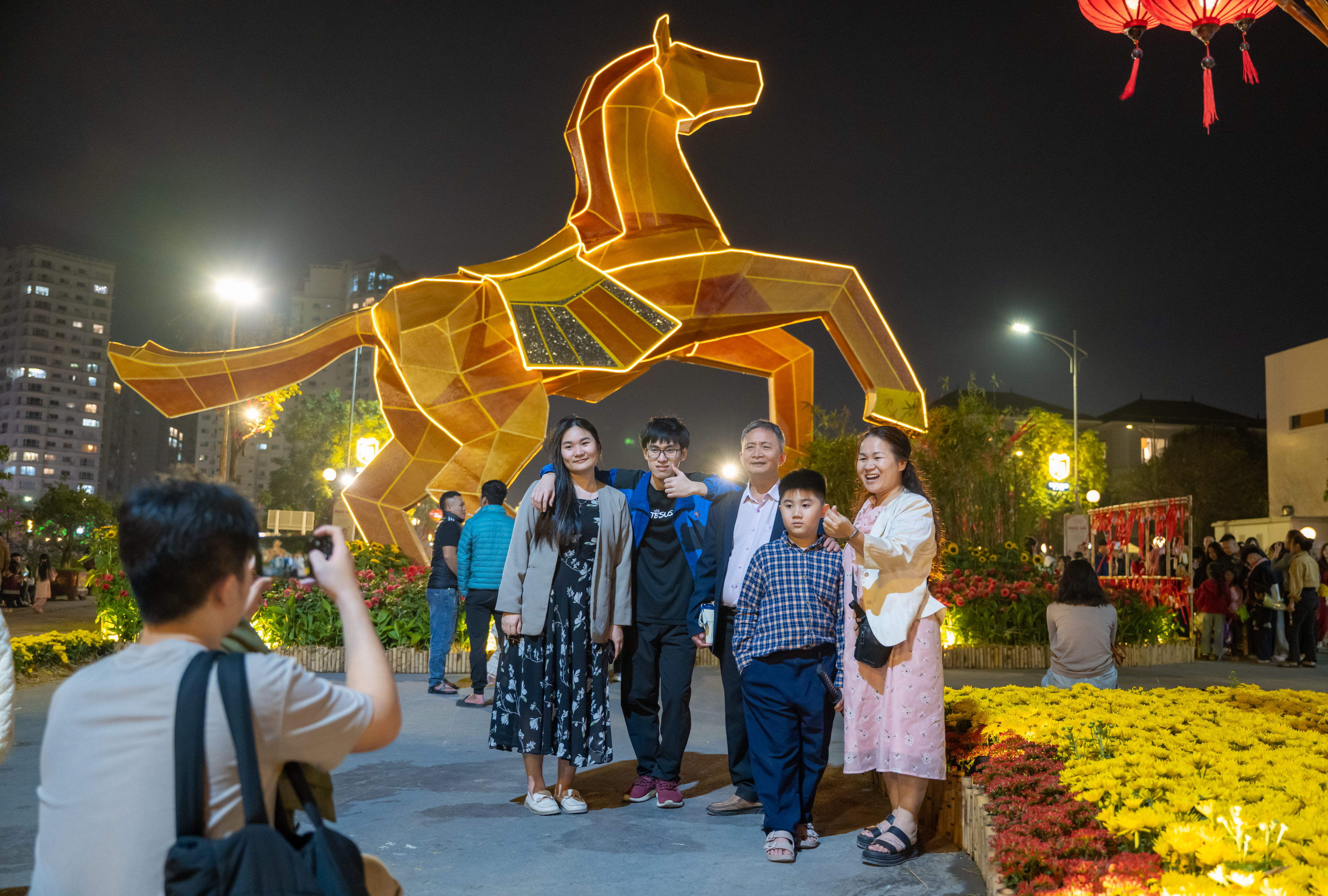 Families gathered at the horse mascot area of the Home Hanoi Xuan 2026 flower street for souvenir photos. Amidst the decorative lights and golden blooms, generations stood together, capturing the transition from the old year to the new.
