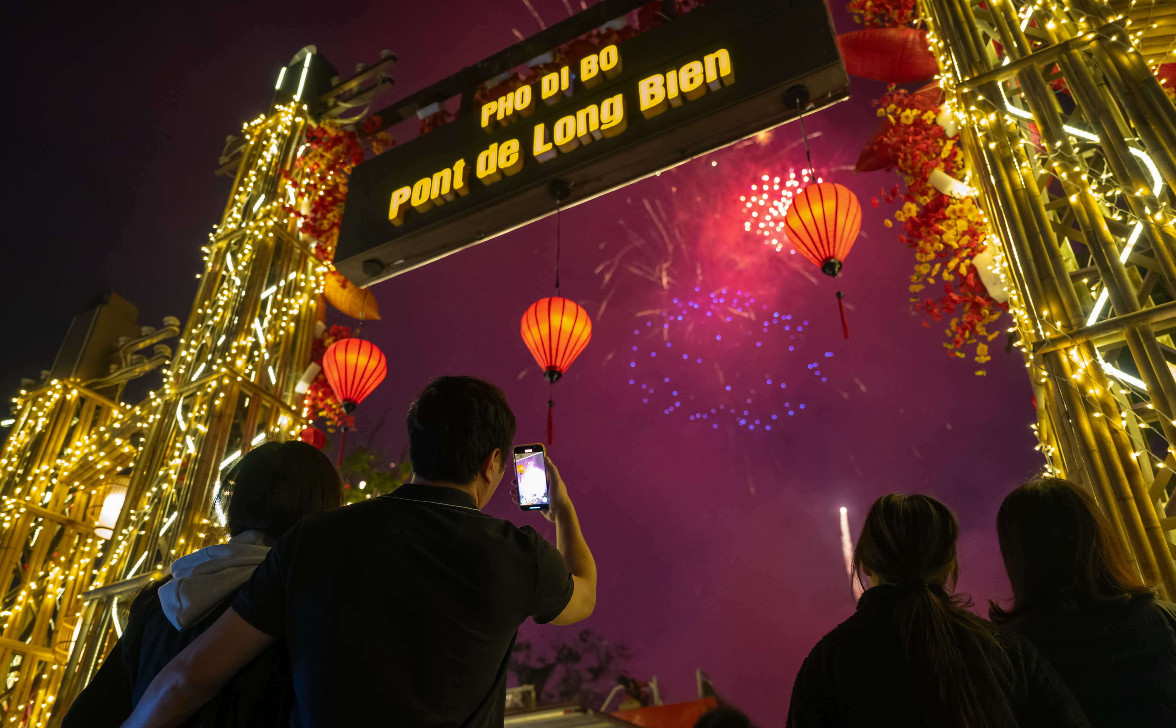At midnight, the fireworks display commenced, transforming Mailand Hanoi City into a vibrant light spectacle lasting about 10 minutes. Spectators from the flower street converged in front of the Pont de Long Bien pedestrian street, marveling at the dazzling fireworks—a traditional new year welcoming ritual.