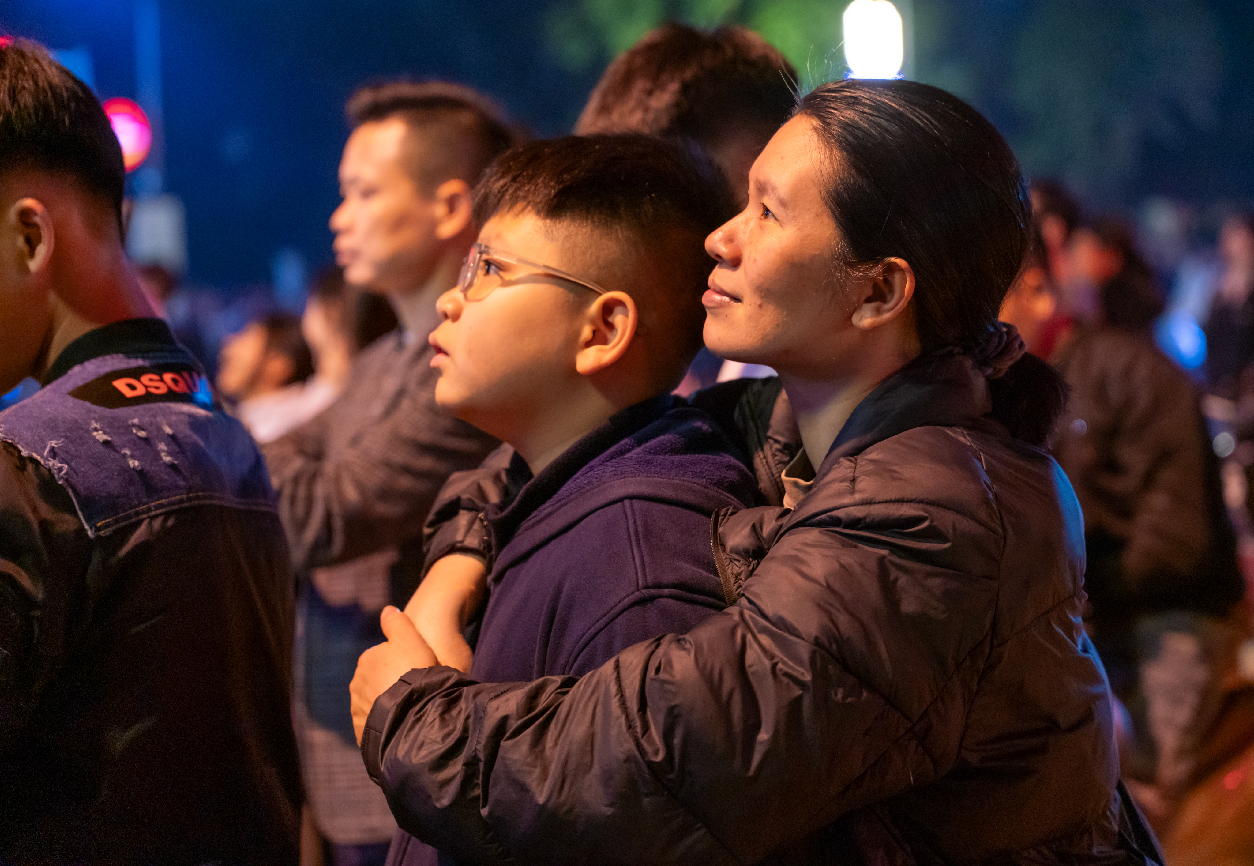 A mother embraced her son, both gazing skyward to watch the fireworks.