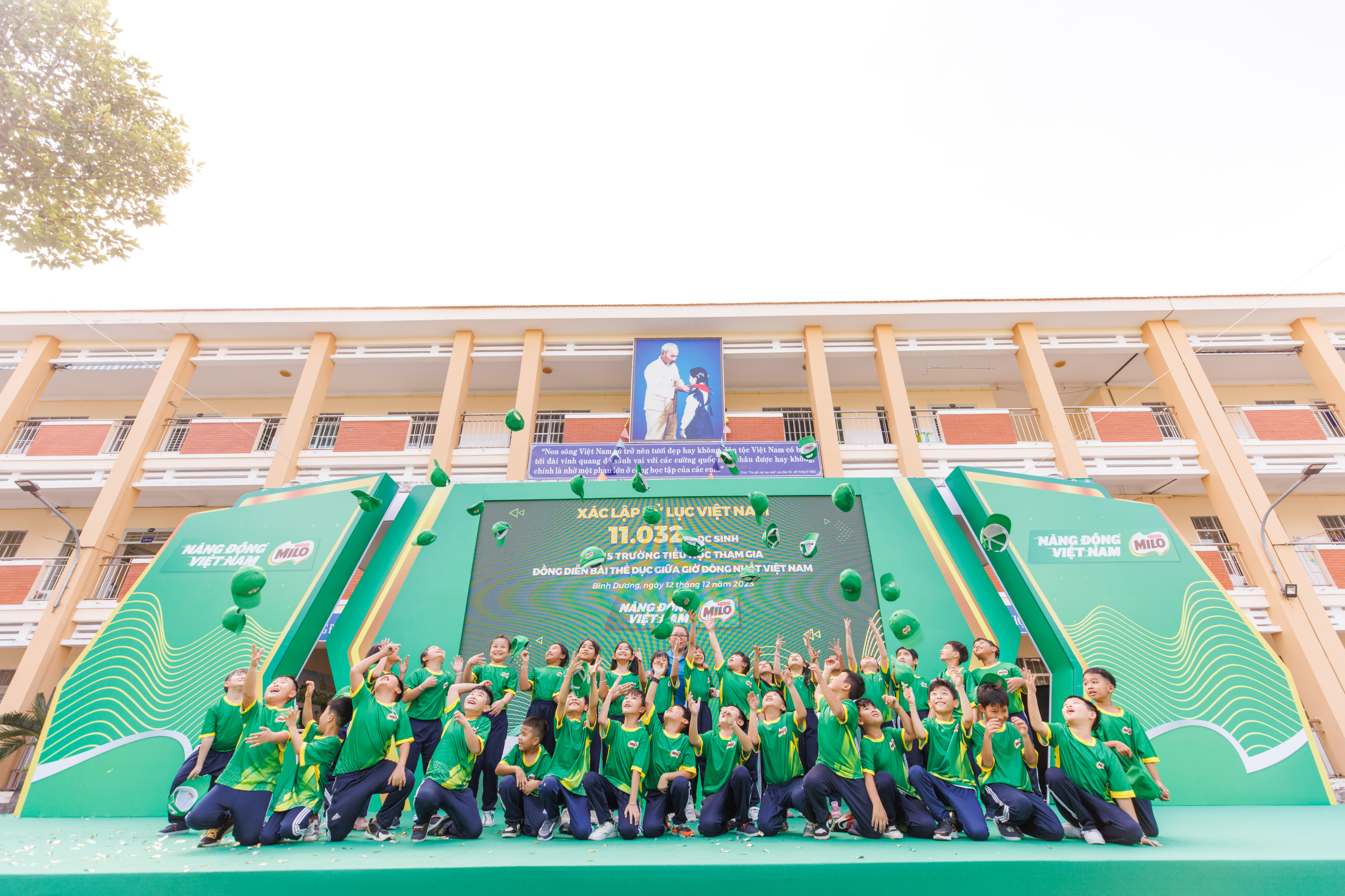 Over 11,000 elementary school students in Binh Duong province perform a synchronized exercise on 12/12/2023, organized by the Binh Duong Department of Education and Training, the Vietnam Student Sports Association (Ministry of Education and Training), and Nestle Milo, setting a record for the "Largest synchronized exercise in Vietnam".