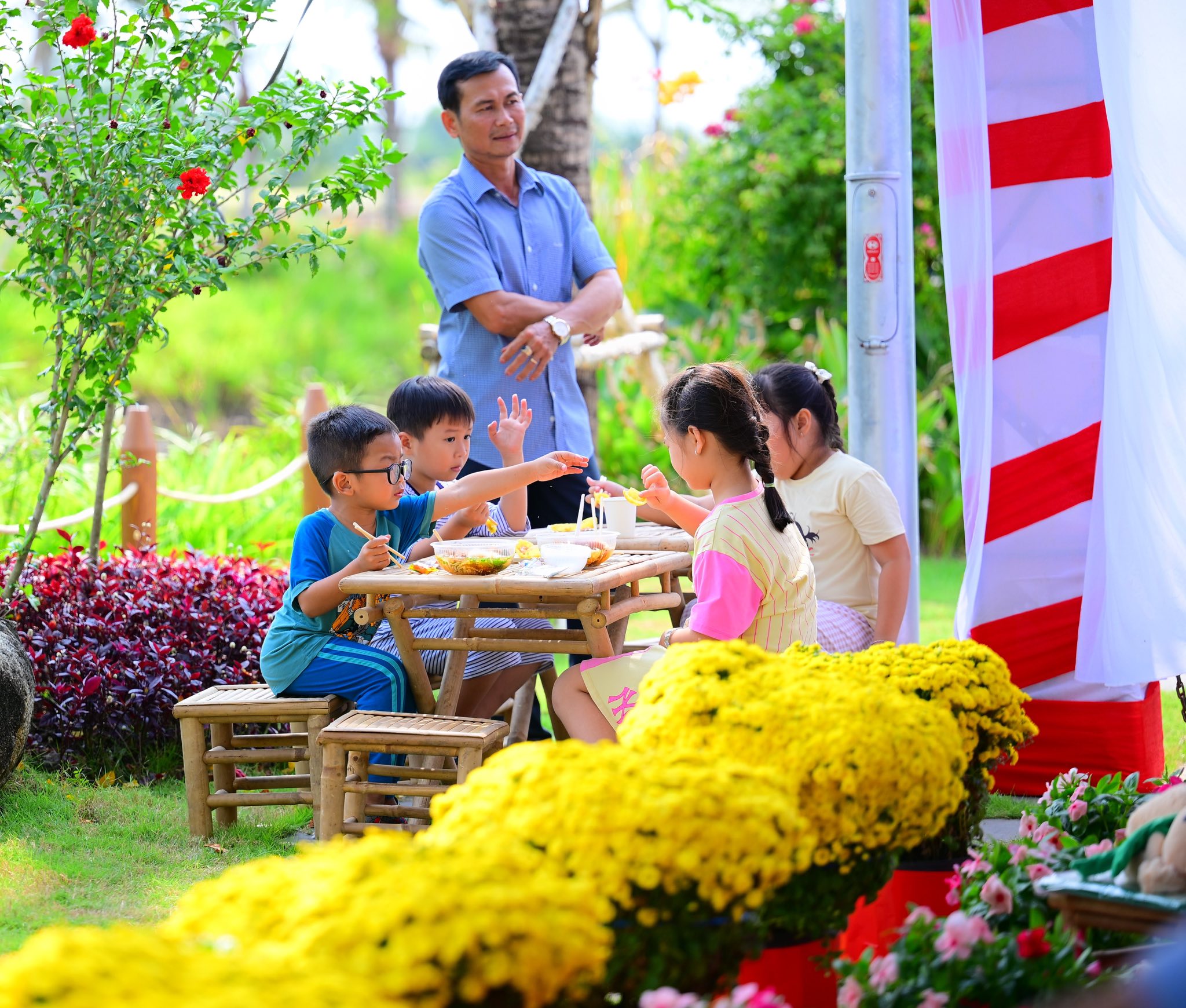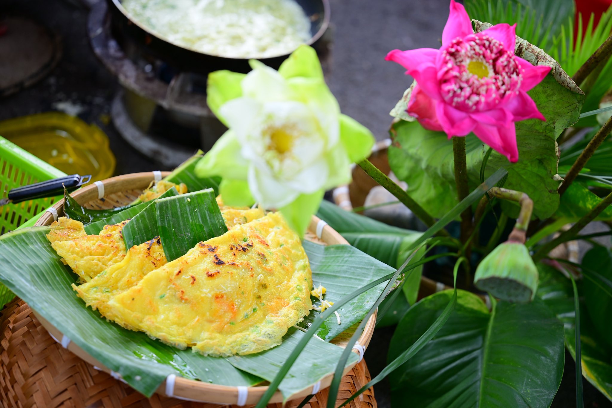 The outdoor food court, featuring dishes like banh xeo, banh khot, che, and bun rieu, is a highlight of the activities.