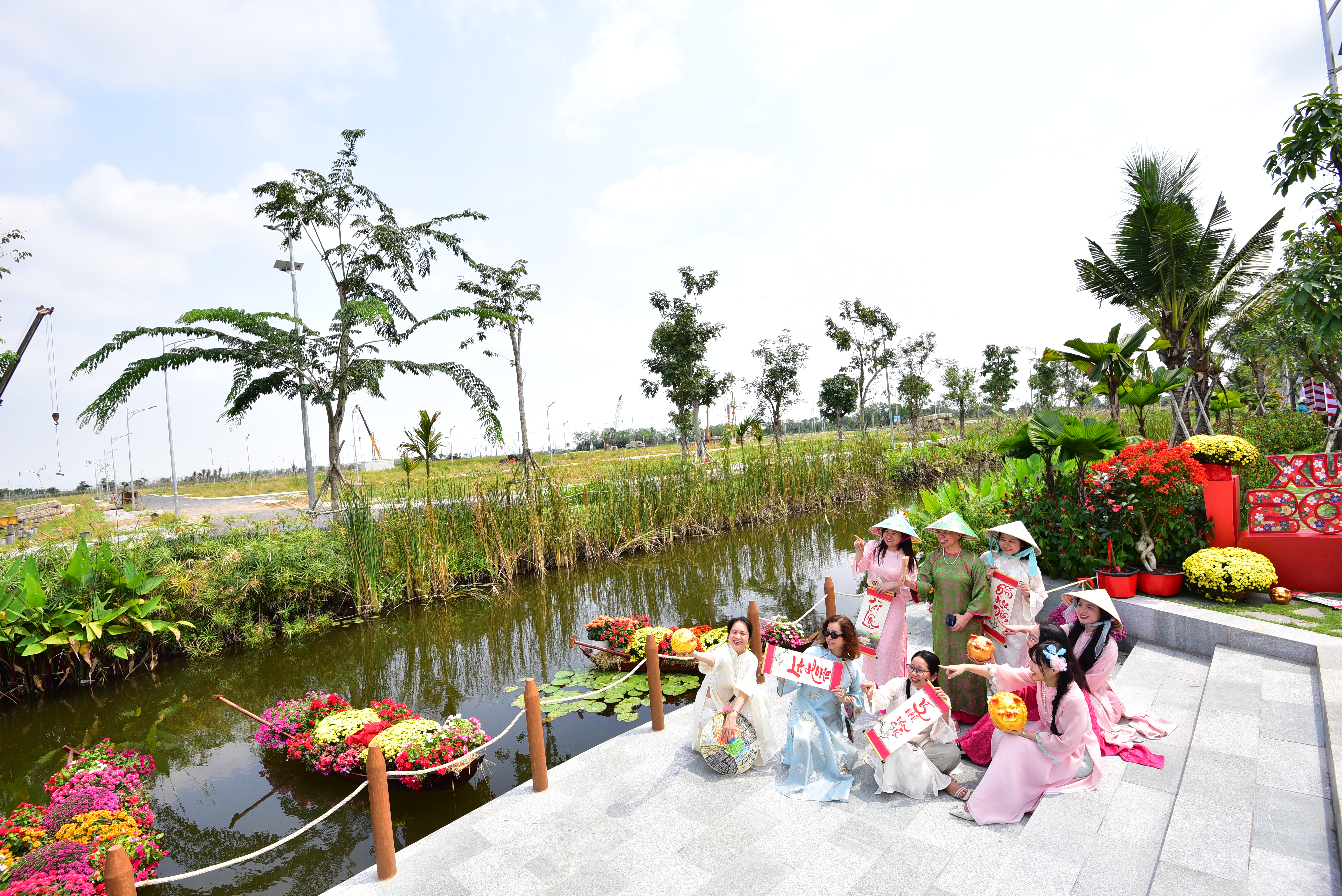 The spring ambiance reflects Southern Tet style, highlighted by a series of flower boats on the canal, evoking river merchants and the waterway culture of the Mekong Delta. Many people visited on weekends for photos. The canals are a distinct feature of LA Home; the developer enhanced seven natural canals, integrating green landscapes across its sections.