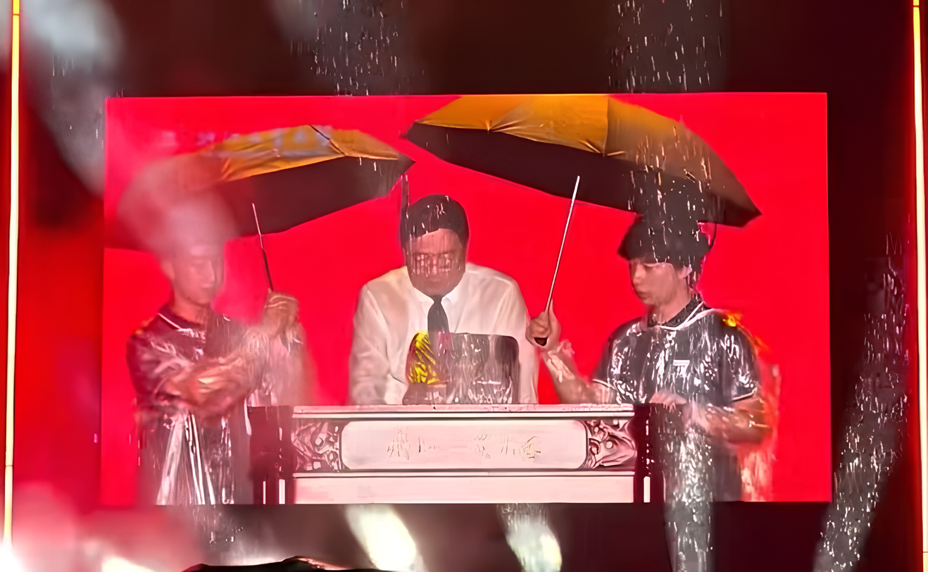 As the rain intensified, two students stepped forward, hoping to shield him, but their clumsiness ended up getting him even wetter.