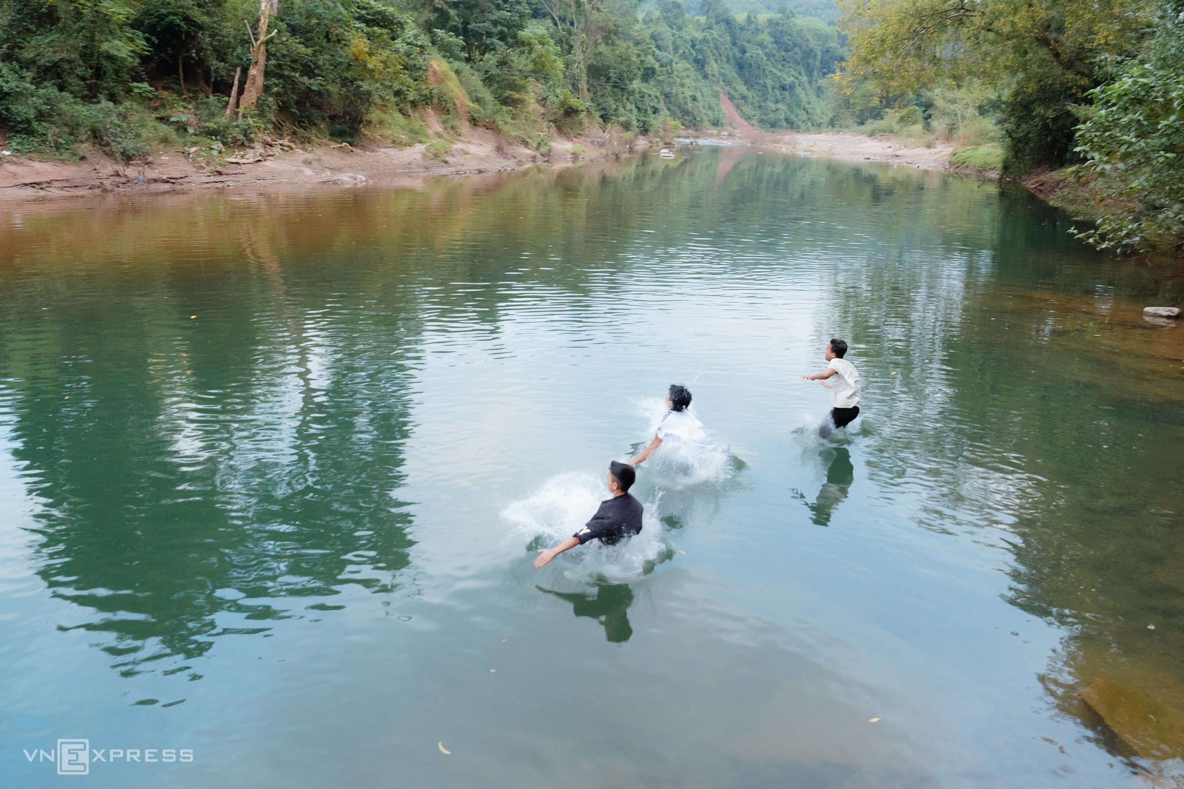 Students at Bo Trach ethnic boarding school bathe in the stream near the school. Tung Dinh.