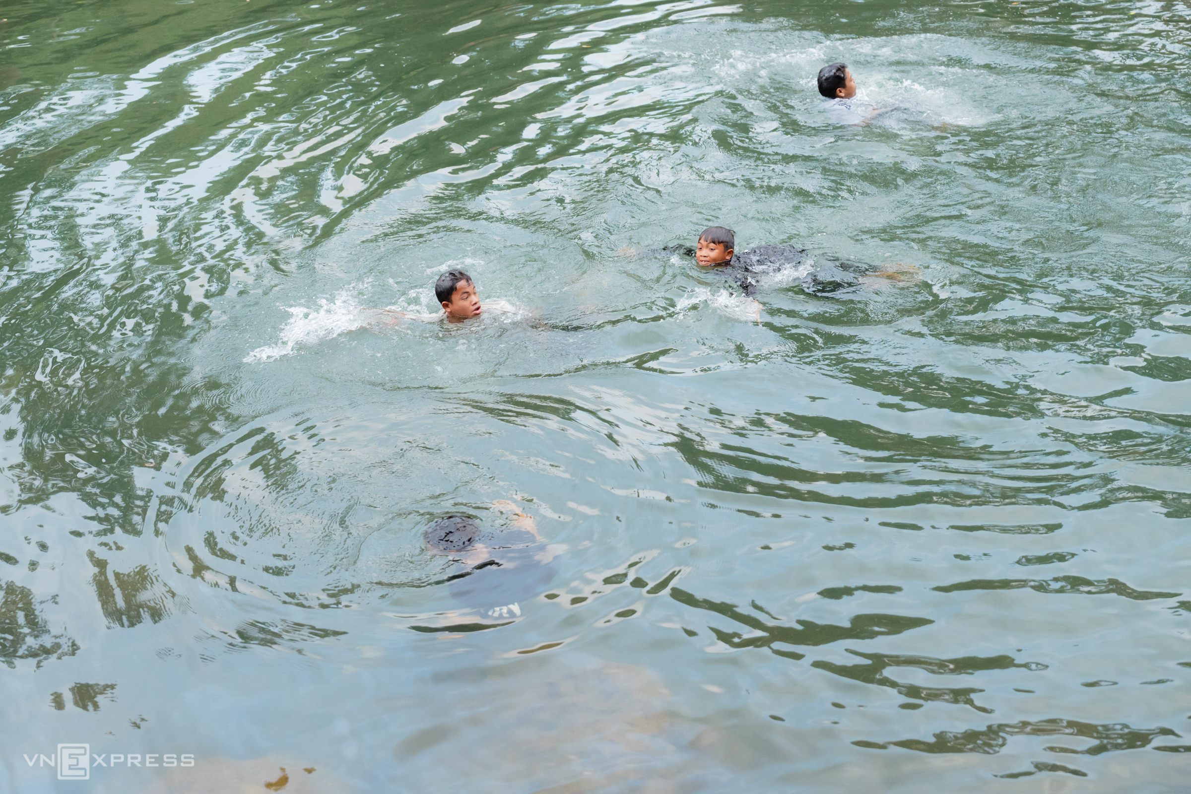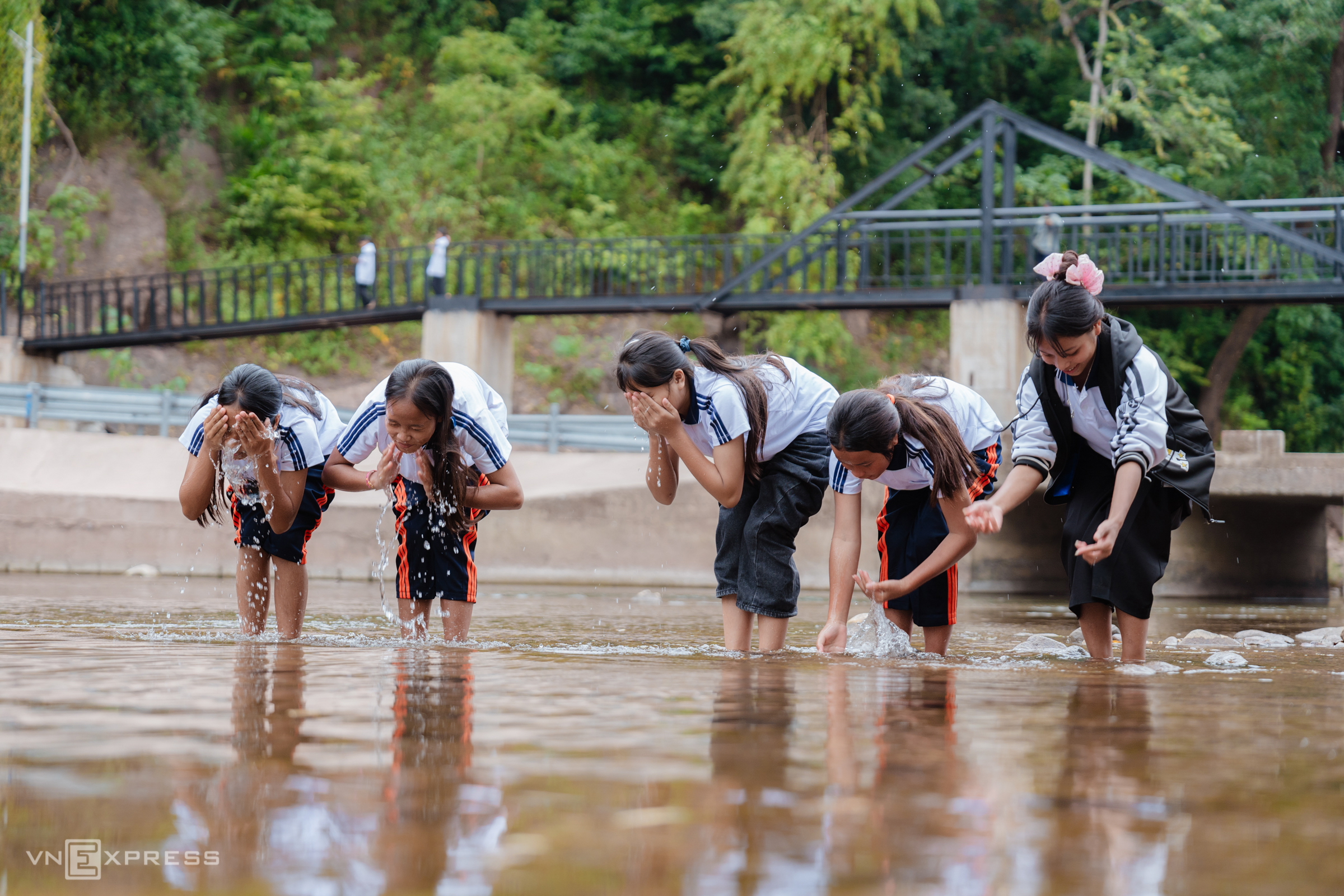 After bathing, the group for personal hygiene wraps towels and returns to school. Tung Dinh.
