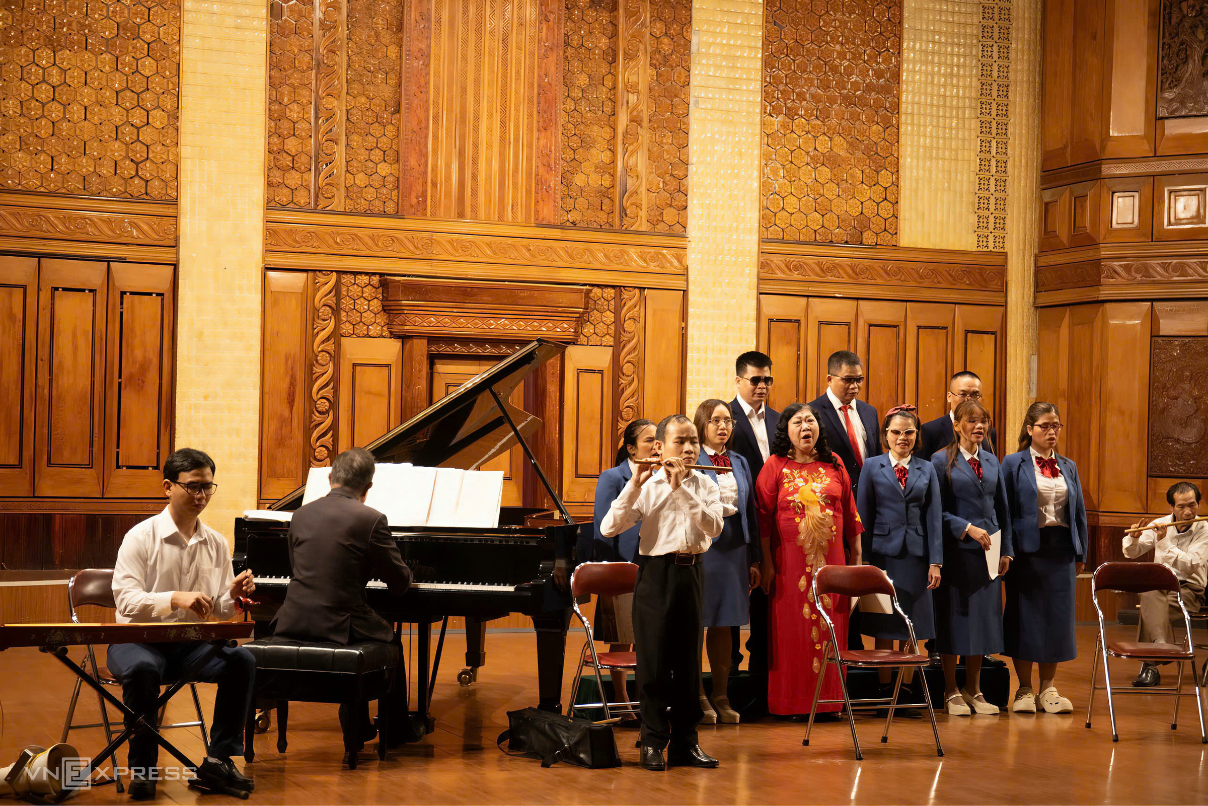 Professor Ton That Triem plays the piano with his wife, artist Xuan Thanh (in a red ao dai), and the Hope Choir performs at the Ha Noi Conservatory, December 2025. Photo: Nga Thanh