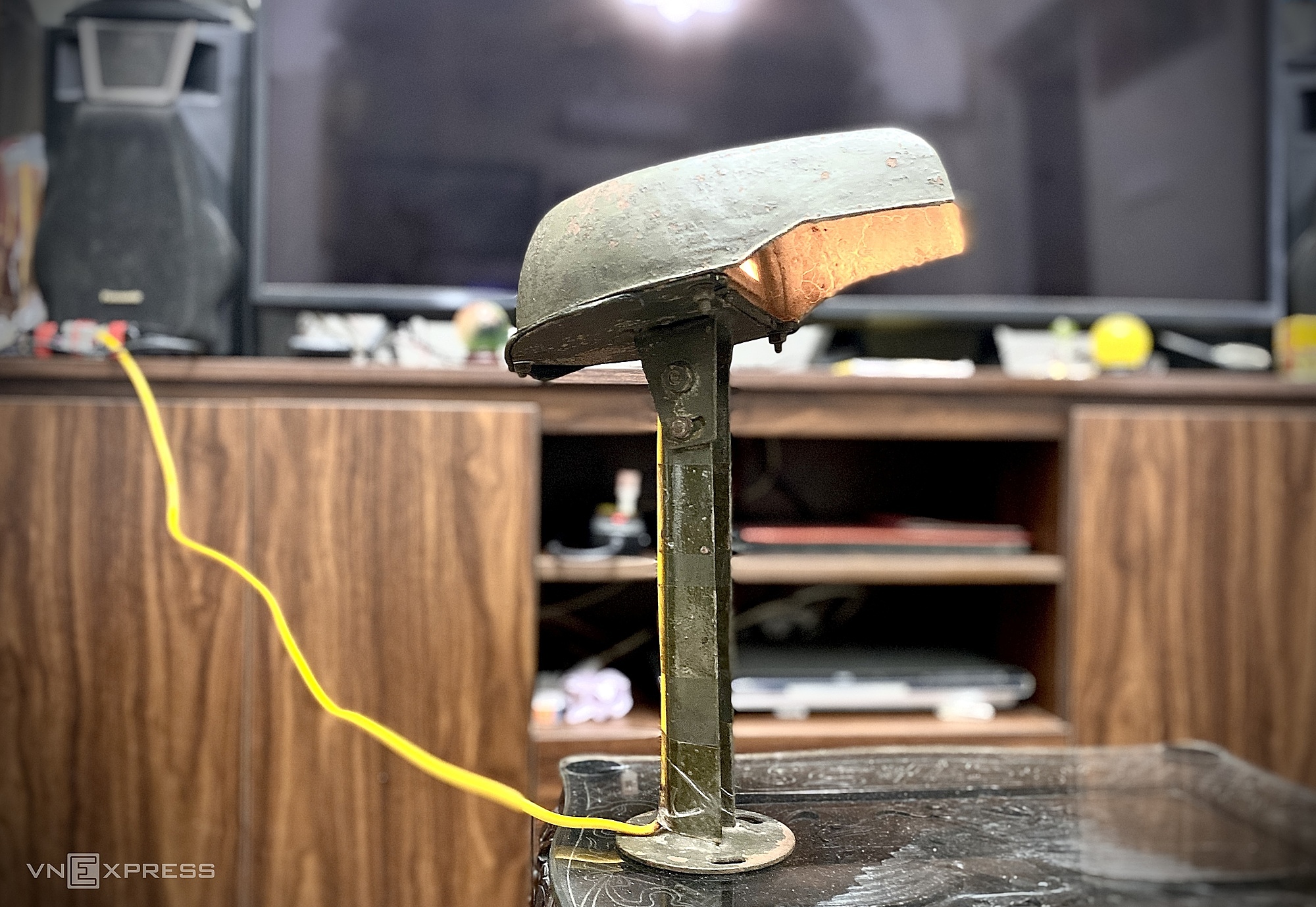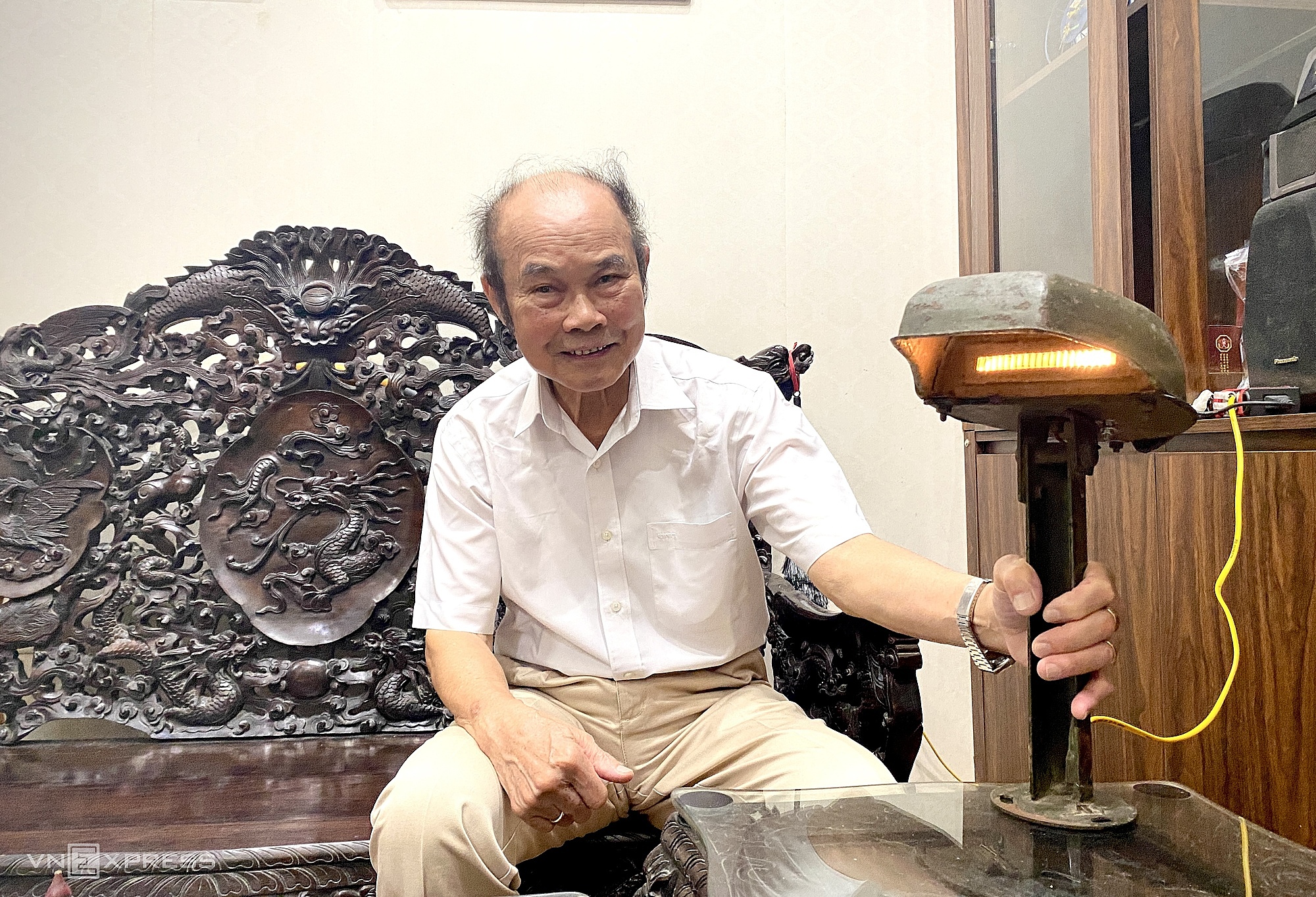 85-year-old engineer Pham Gia Nghi and a 1967 turtle lamp. Photo: Quynh Nguyen