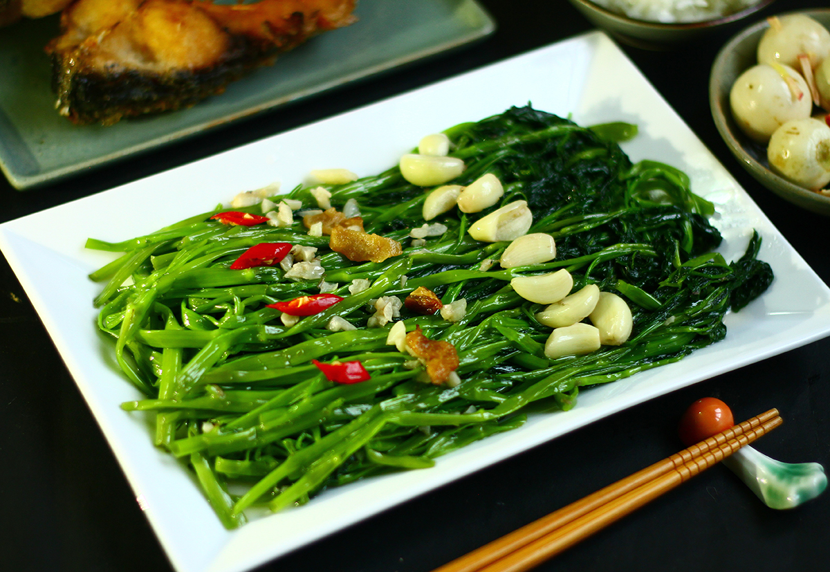 Stir-fried morning glory with garlic. Photo: Bui Thuy |