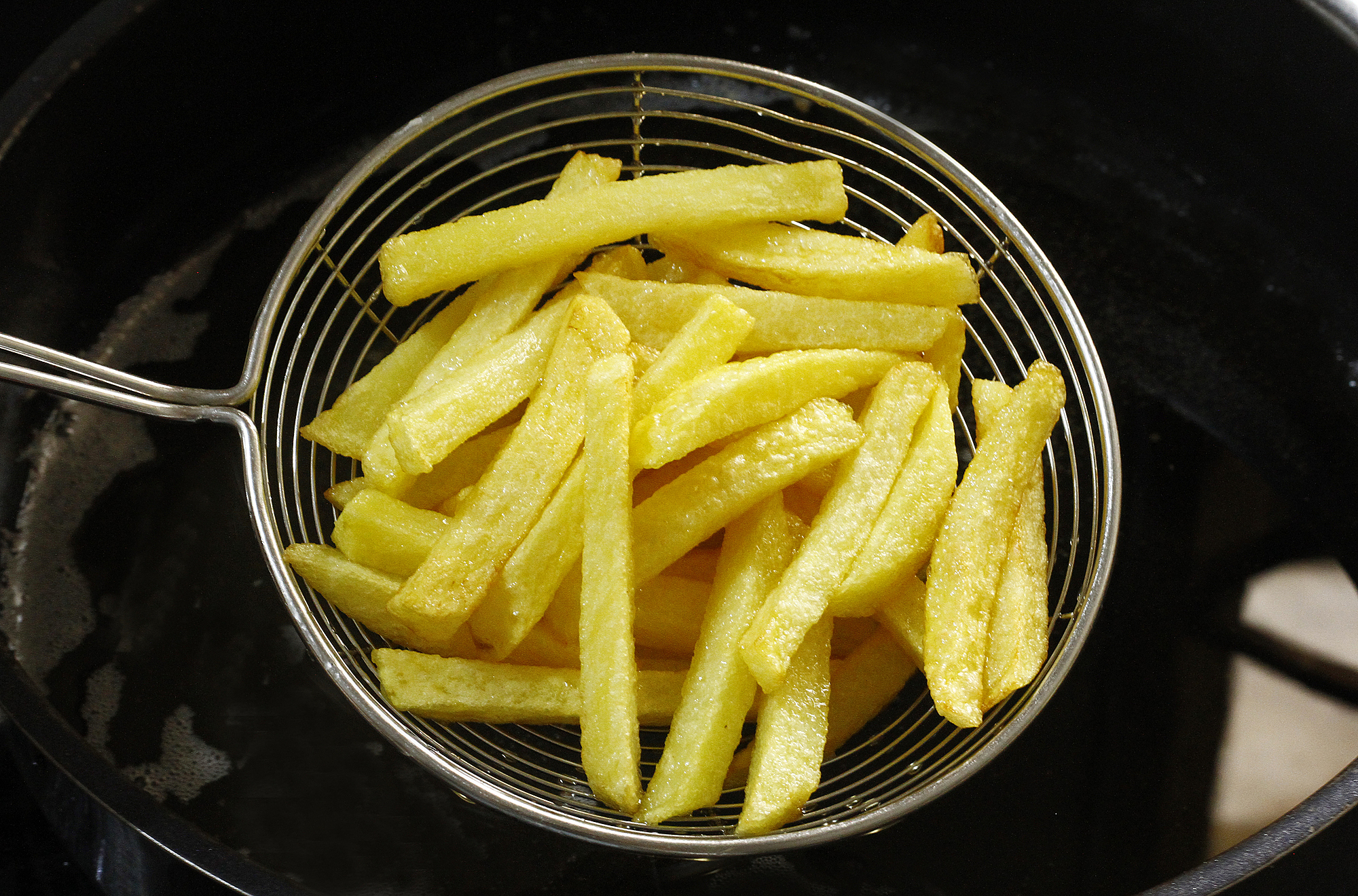 The first fry lightly cooks the potatoes. Bui Thuy