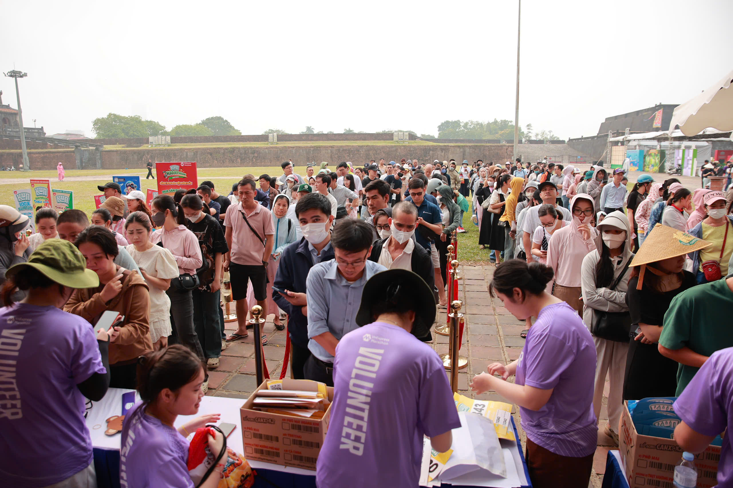 Race kit distribution for Kun Marathon Hue began at 8h on 17/4 at Ngo Mon Square. However, hundreds of parents and children had already arrived by 7h, eager to complete the collection process. After several seasons of strong support from parents in the ancient capital, this year's event expanded to include 2,500 athletes. |