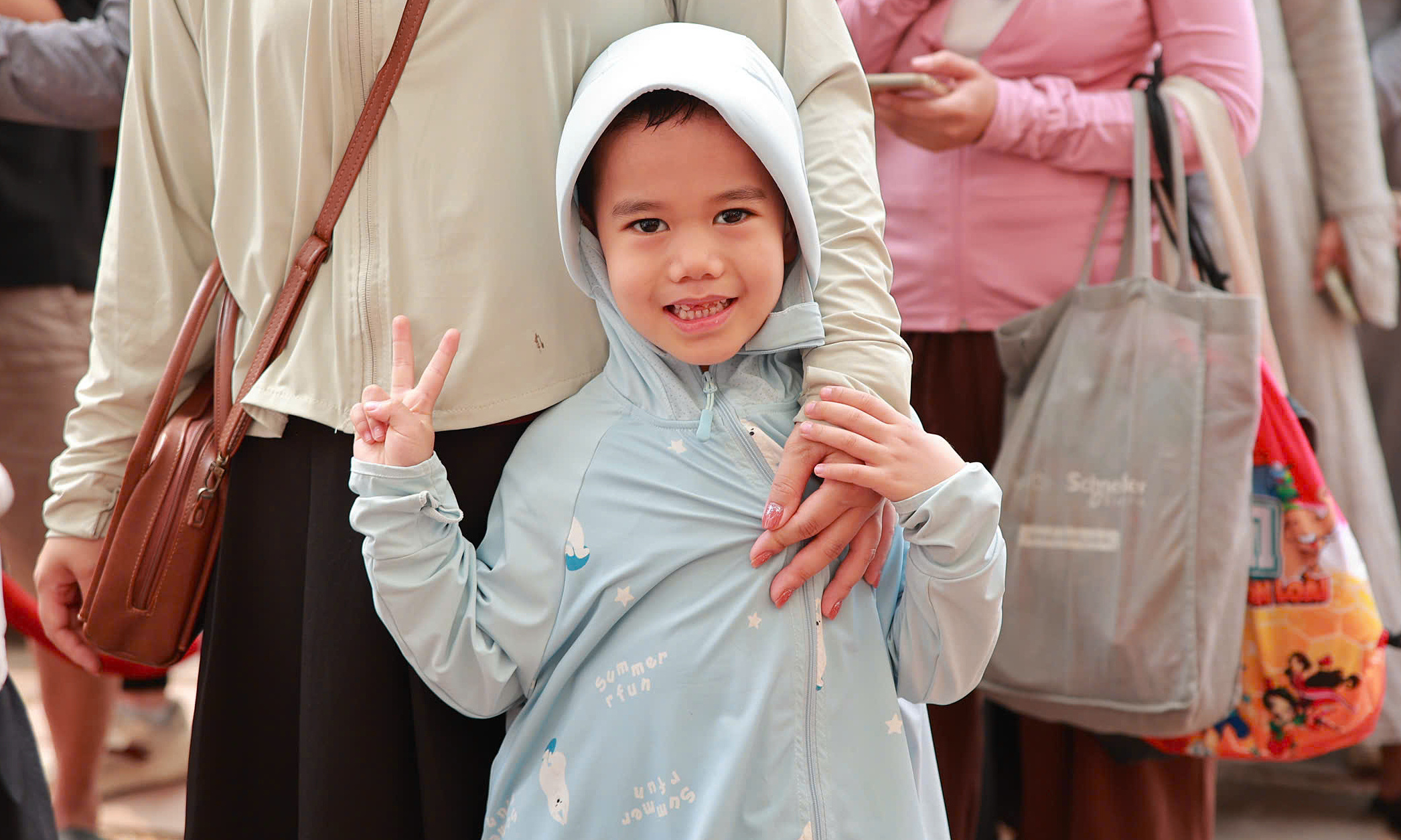 Many young children accompanied their parents, eager to soak in the bustling bib collection atmosphere. Most remained quite shy, rarely venturing far from their parents' embrace while waiting for the procedures to be completed. |