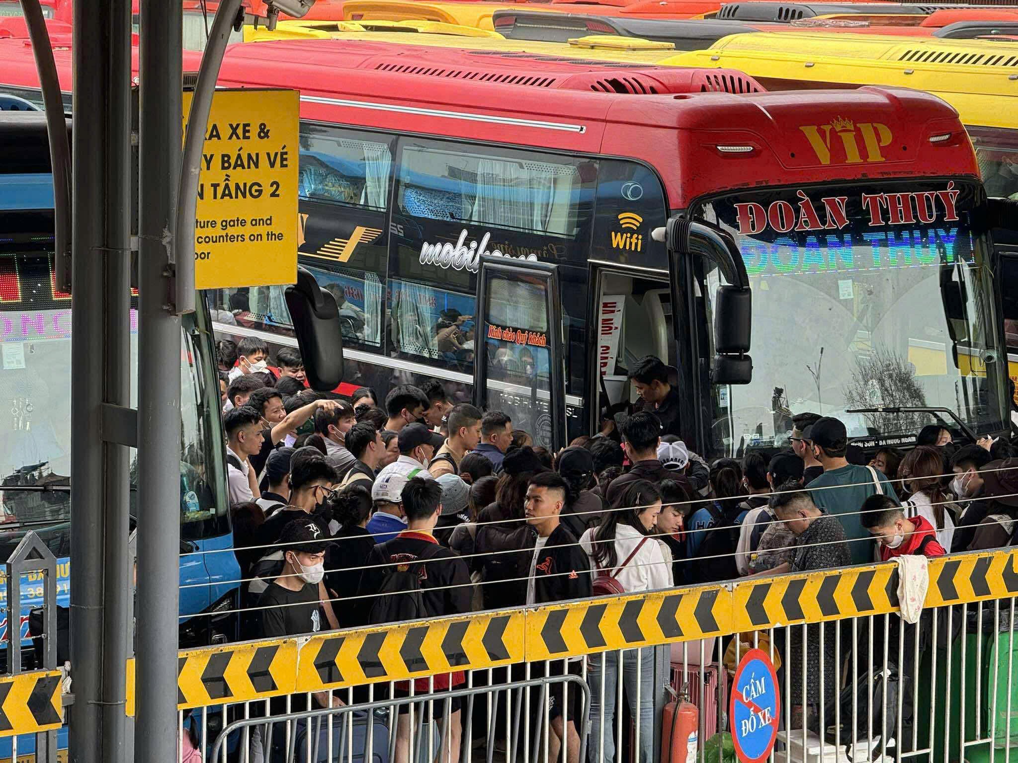 Crowds boarding a bus at Nuoc Ngam bus station, Hanoi, during the 30/4-1/5 2025 holiday. *Photo: Nga Thanh*