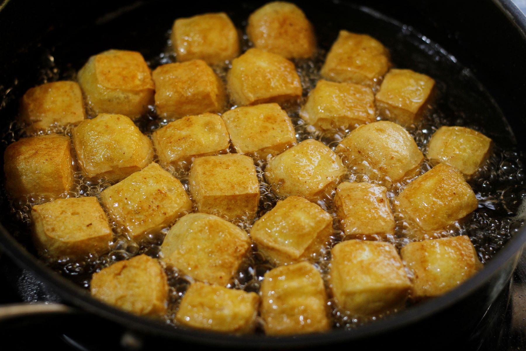 When frying with less oil, the temperature in the pan fluctuates constantly. Each time food is added, the oil temperature drops. For ingredients with high water content, such as meat, fish, or tofu, a low temperature is insufficient for surface water to evaporate rapidly.