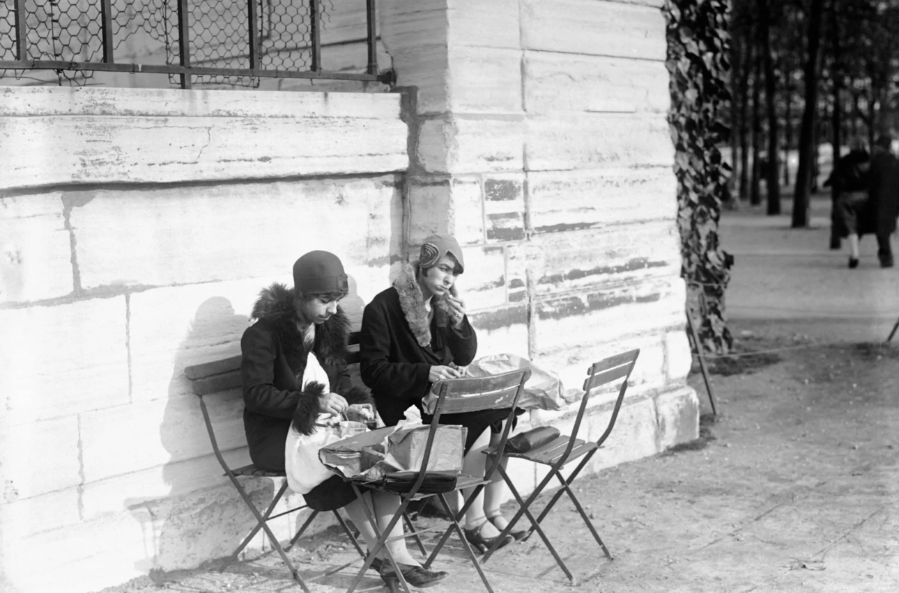 Two young women enjoy an outdoor lunch in Paris in 1/1929. *Photo: Gamma-Keystone* |