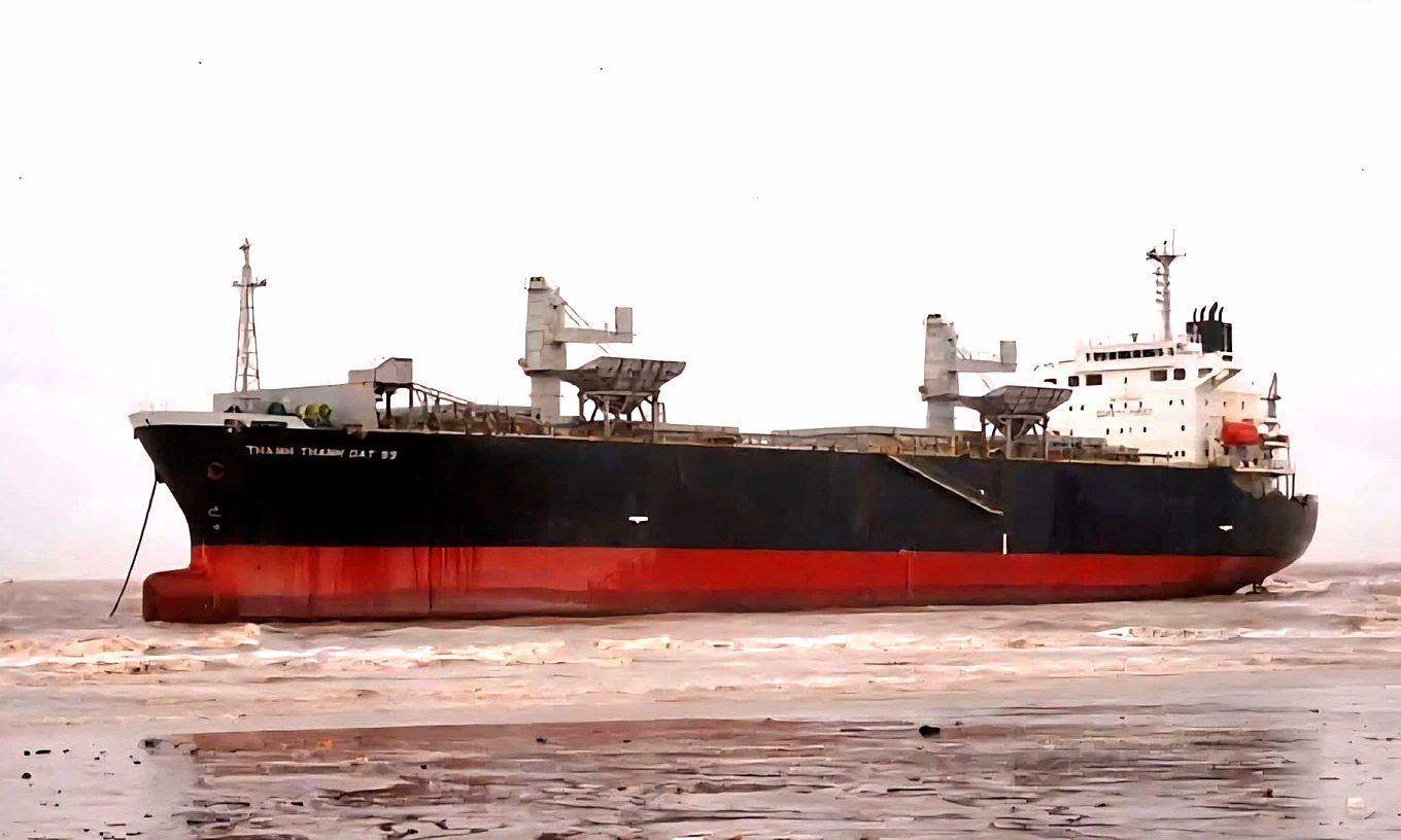 The 151-meter-long, 26-meter-wide Thanh Thanh Dat 99, captained by Hoang Van Hop from Nghe An province, ran aground after encountering Typhoon Kajiki.