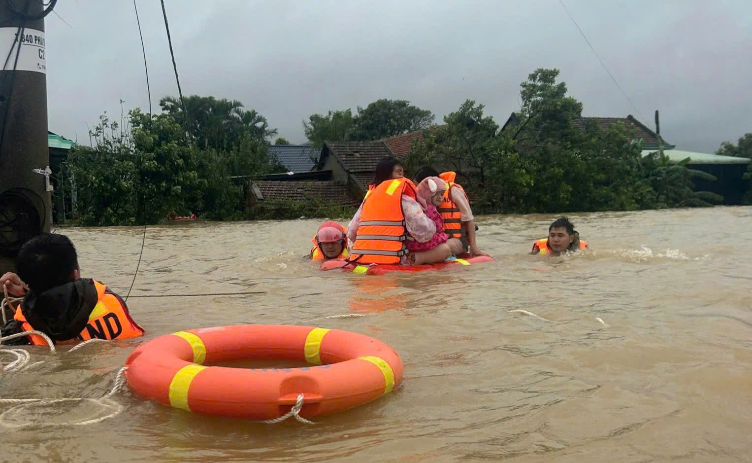 Hoa Xuan commune police rescuing residents as floodwaters rise. *Photo: Thai Ha* |