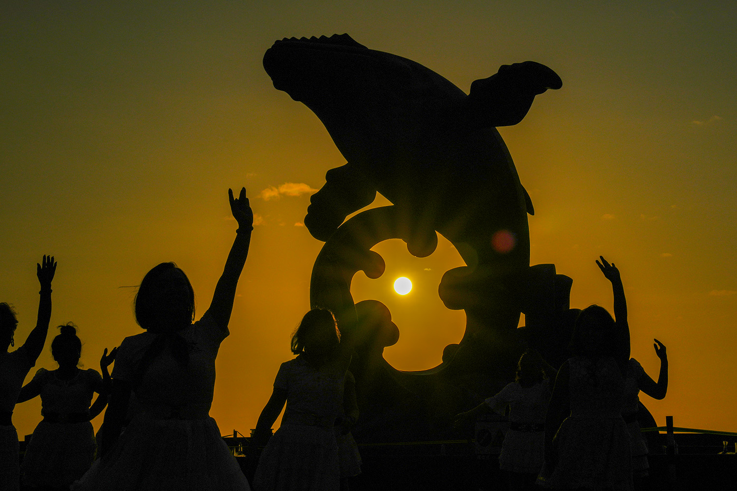 The statue is cast from red copper, 20 mm thick, and stands on a stone base in the center of a pond. It is complemented by an artistic water spray and lighting system. The project's lifespan is estimated to be 100 years.