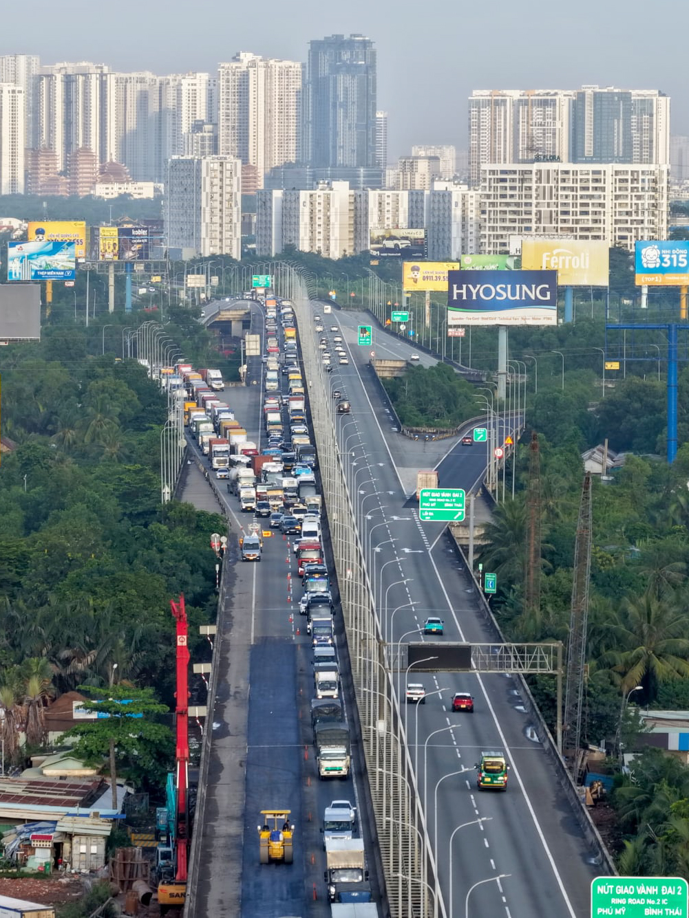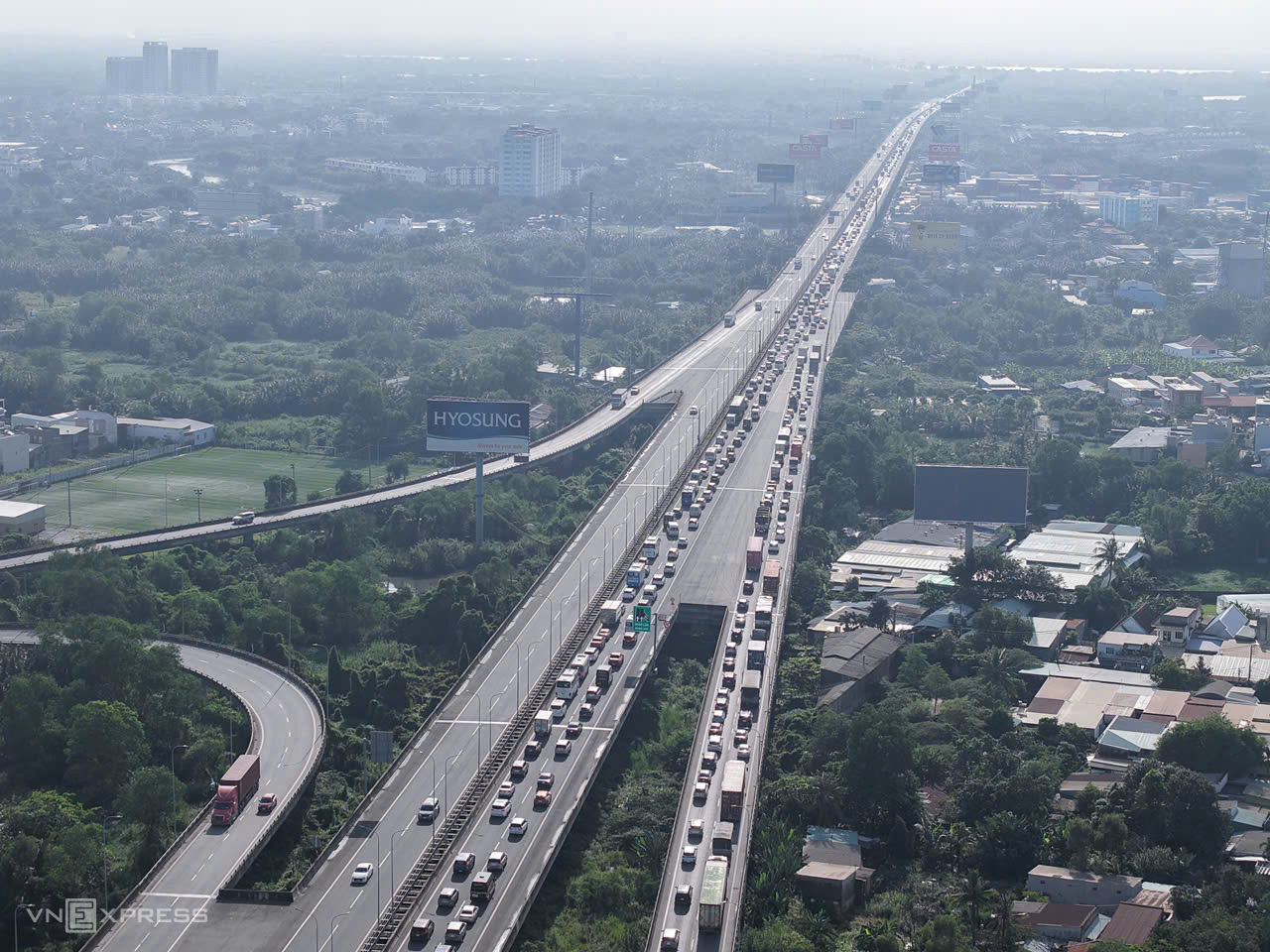 Traffic jam stretches from the An Phu roundabout towards the Long Thanh expressway, at the intersection of Ring Road 2 and Nhon Trach, at 6:15 a.m. Road repairs have reduced some sections to a single lane, causing congestion since 5 a.m. Photo: Tran Linh