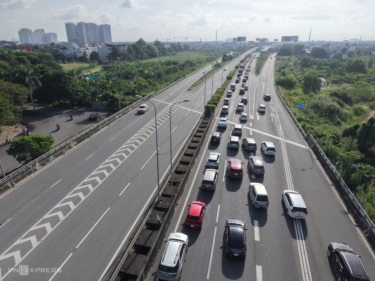 The Ho Chi Minh City - Dong Nai lane is jammed with vehicles, while the other lane remains clear. Photo: Tran Linh
