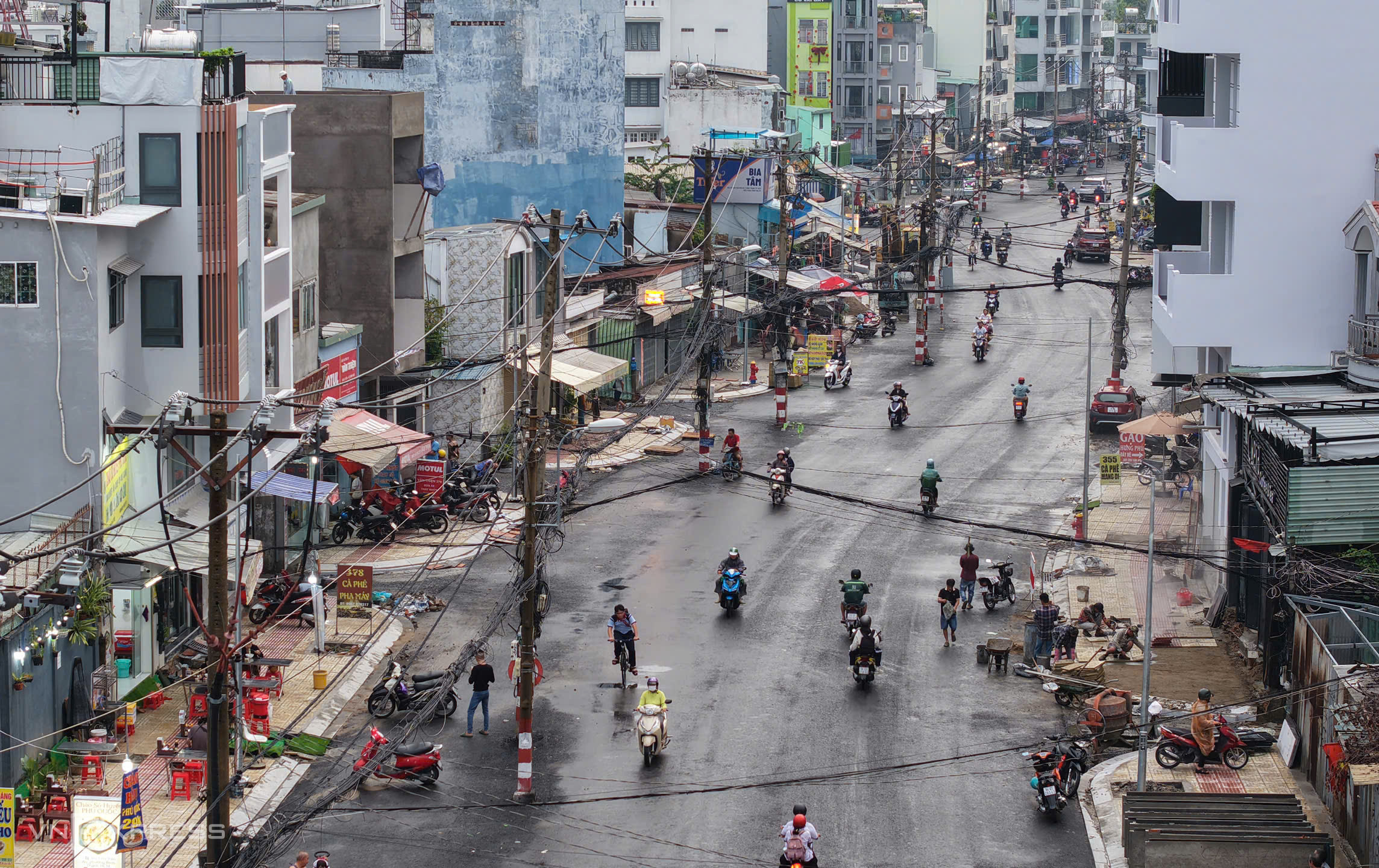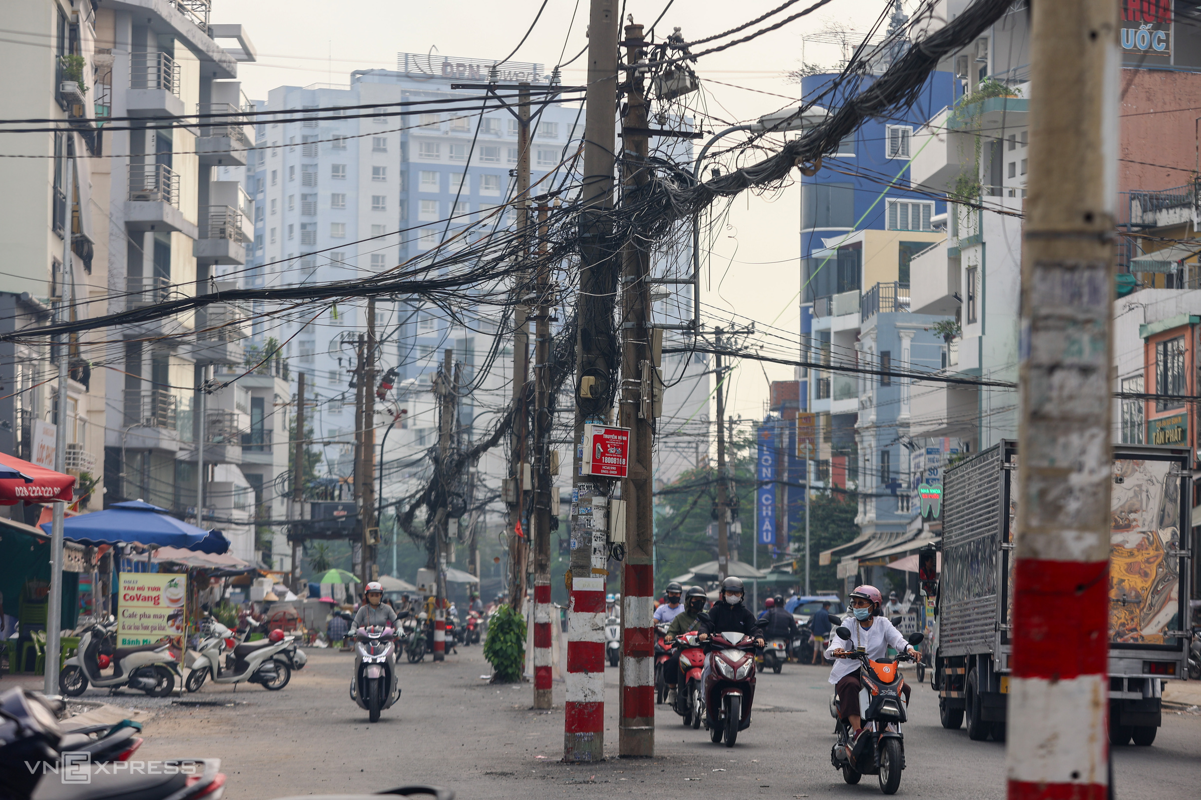 Electrical wires crisscross like spiderwebs overhead, creating an unsightly view. At night, the risk of accidents increases due to limited visibility, while the lighting system is not yet fully integrated.