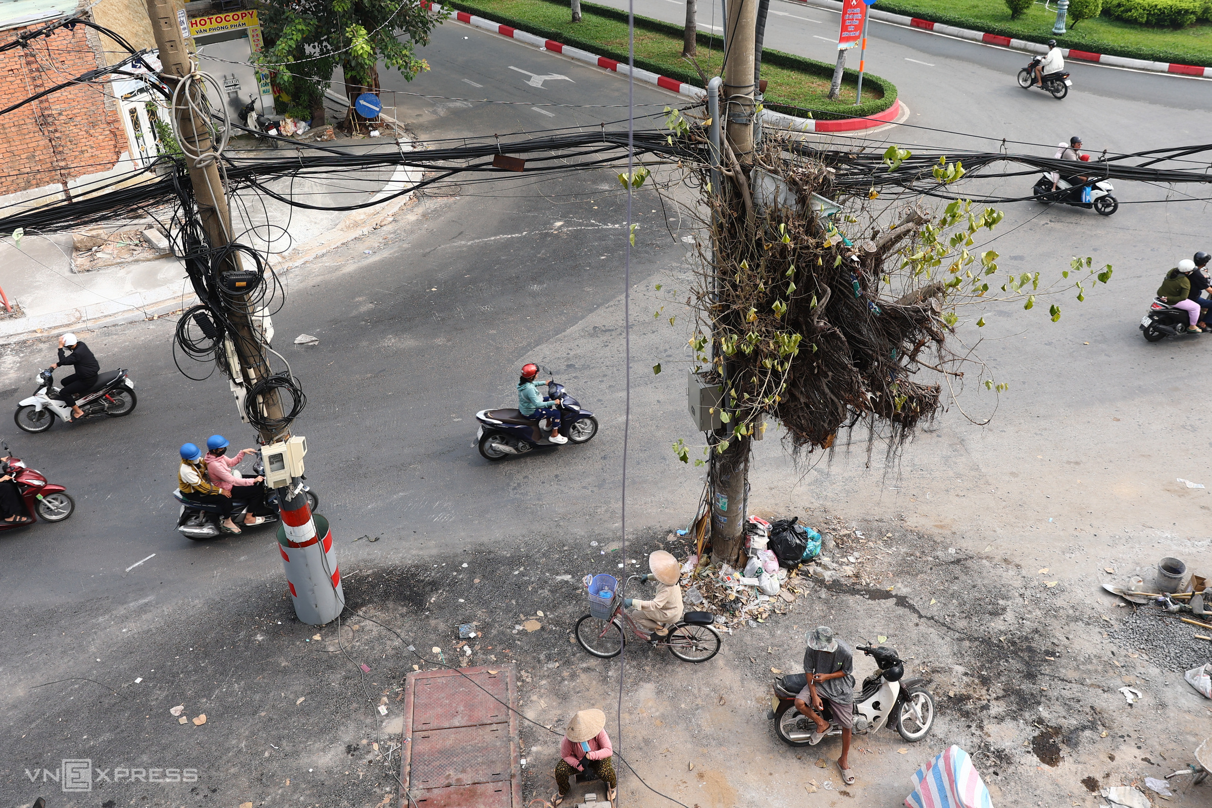 A power pole at the intersection with Phan Chu Trinh street is still entangled with dangling tree roots, yet to be removed.