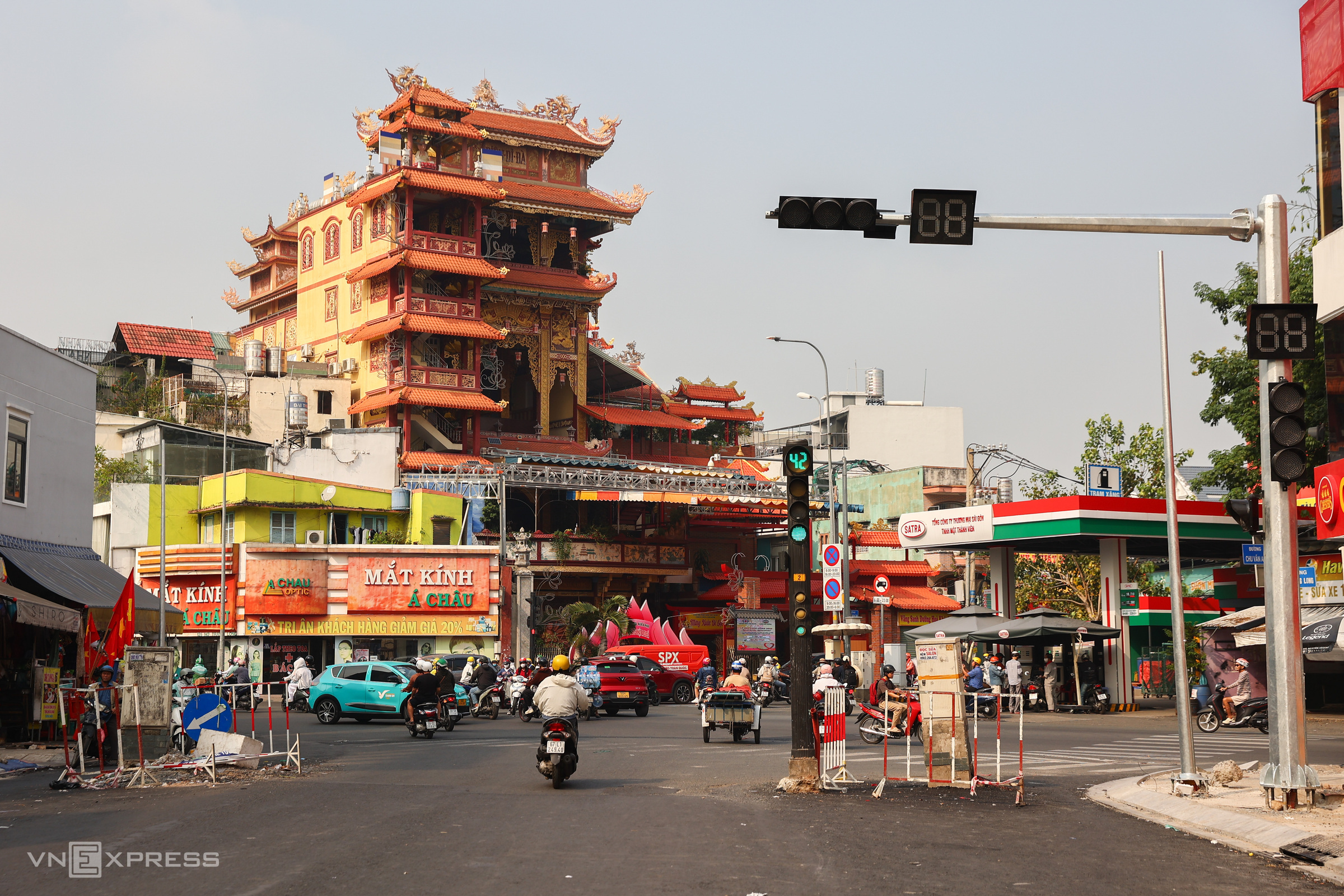 At the intersection with No Trang Long street, the electrical cabinet and traffic lights remain in their old positions from before the road widening. Nearby traffic signals are not in use as they are not yet connected to the electrical system.