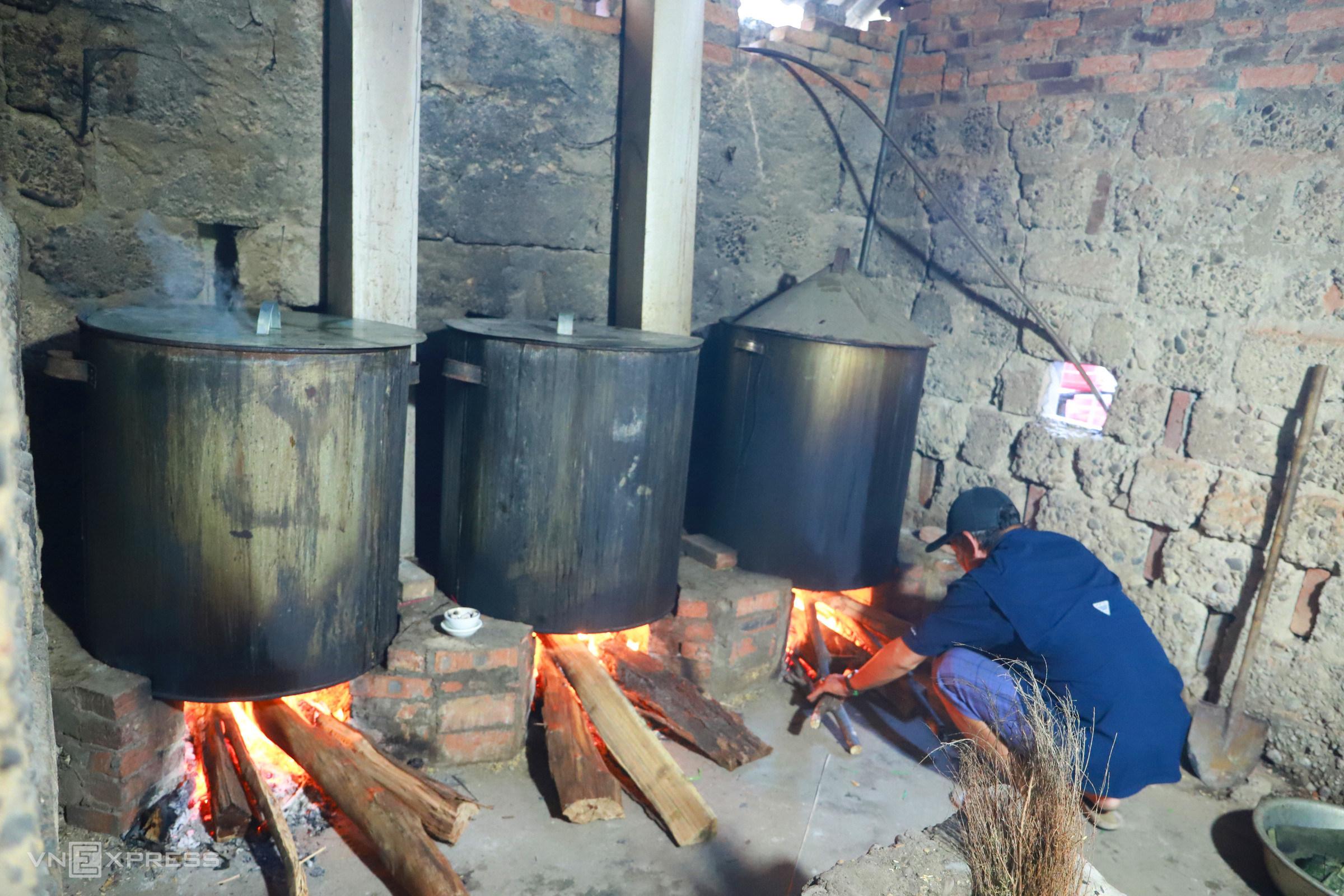 To cook large quantities of banh tet, An Truyen facilities use large pots placed over wood-burning stoves. Throughout the 12 hours of cooking, the cake makers constantly monitor the pots, adding water and wood to maintain a steady fire for thorough cooking.
