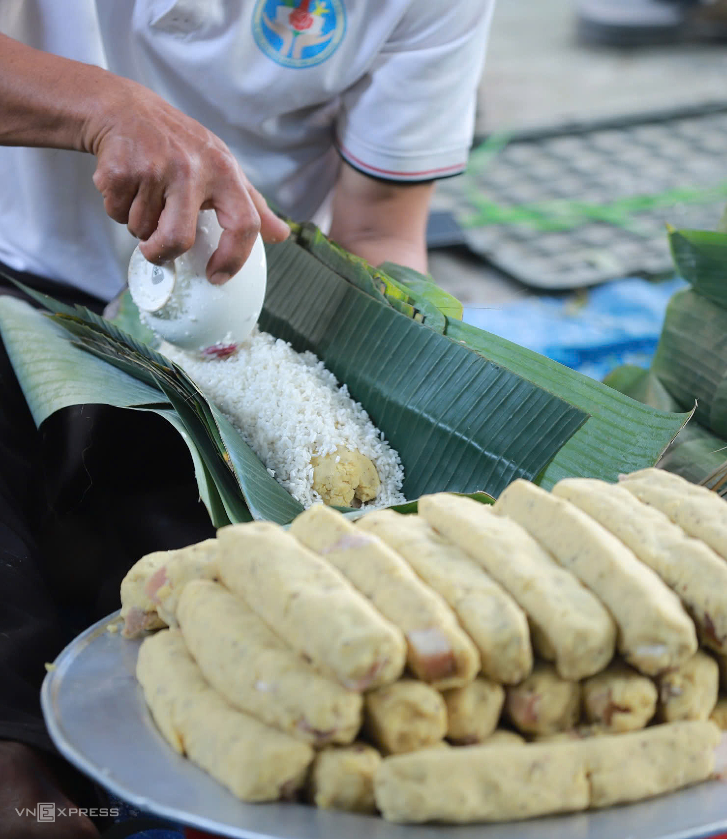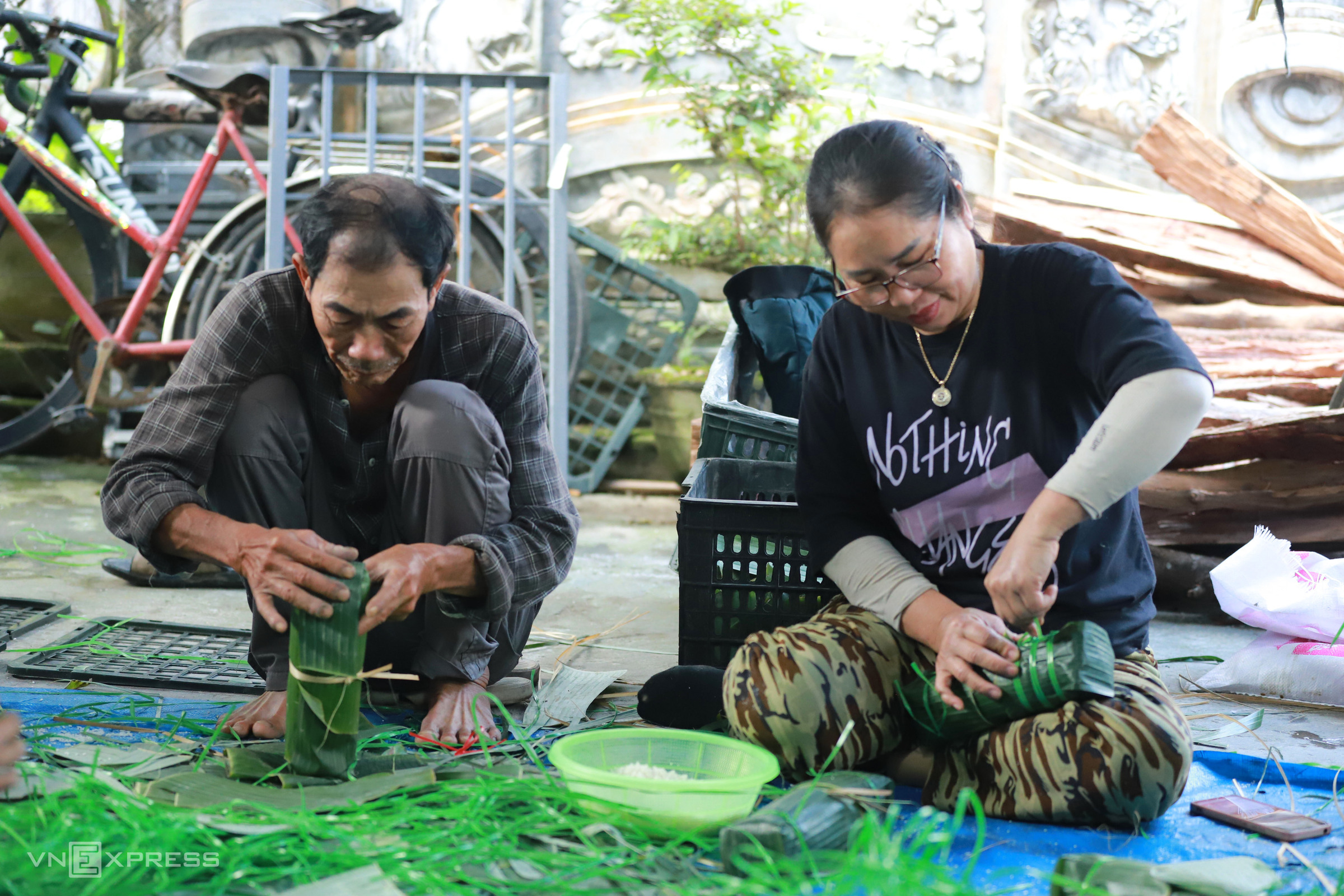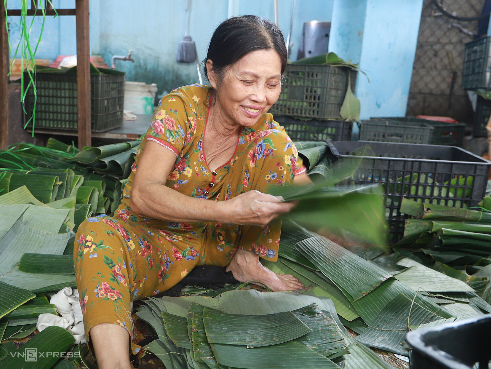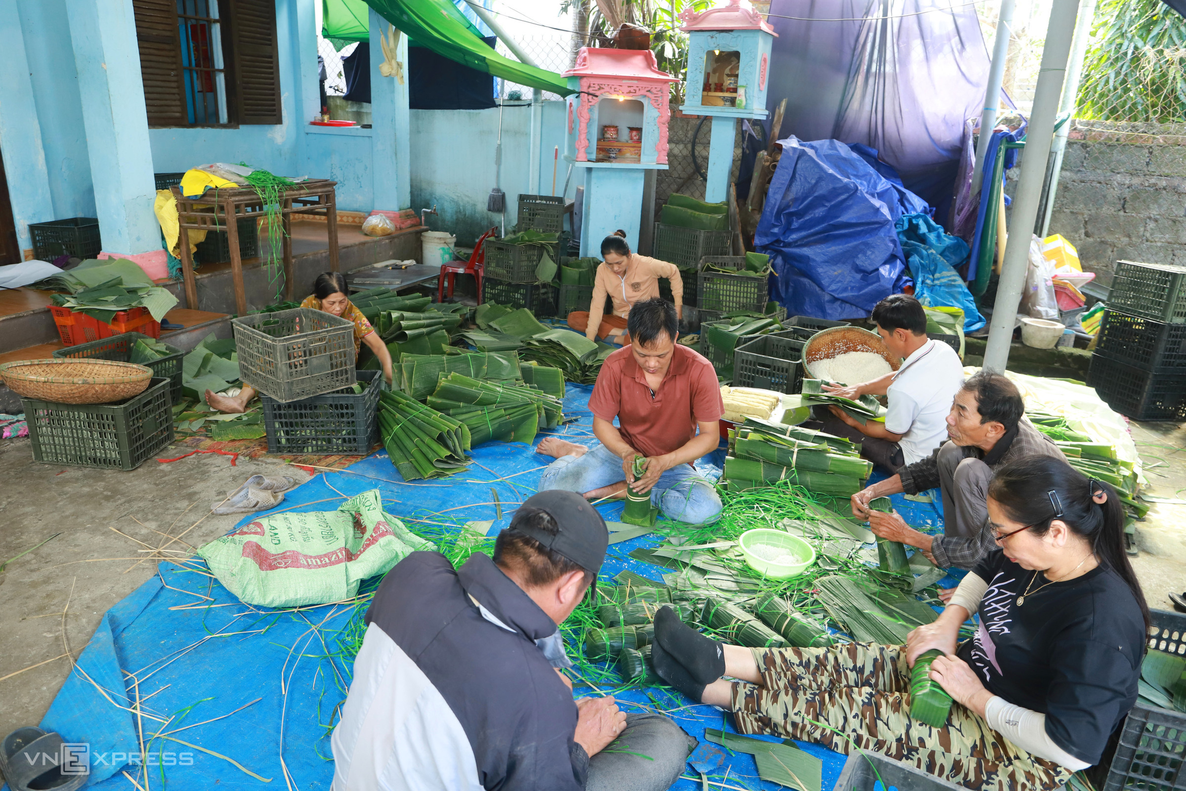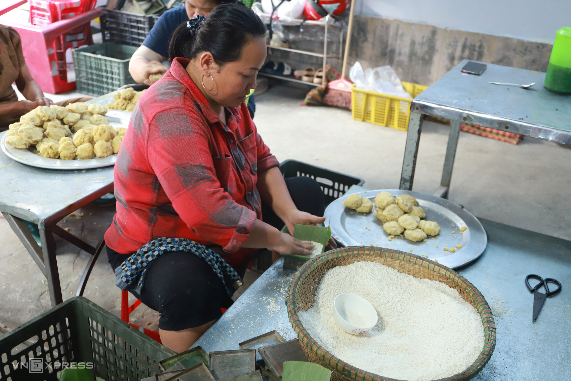 At facilities like Ms. Nghiep's in hamlet 9, over 10 workers gather in the courtyard, skillfully wrapping the cakes. Each person handles one specific step. Older workers select and sort banana leaves before they move to the wrapping stage.