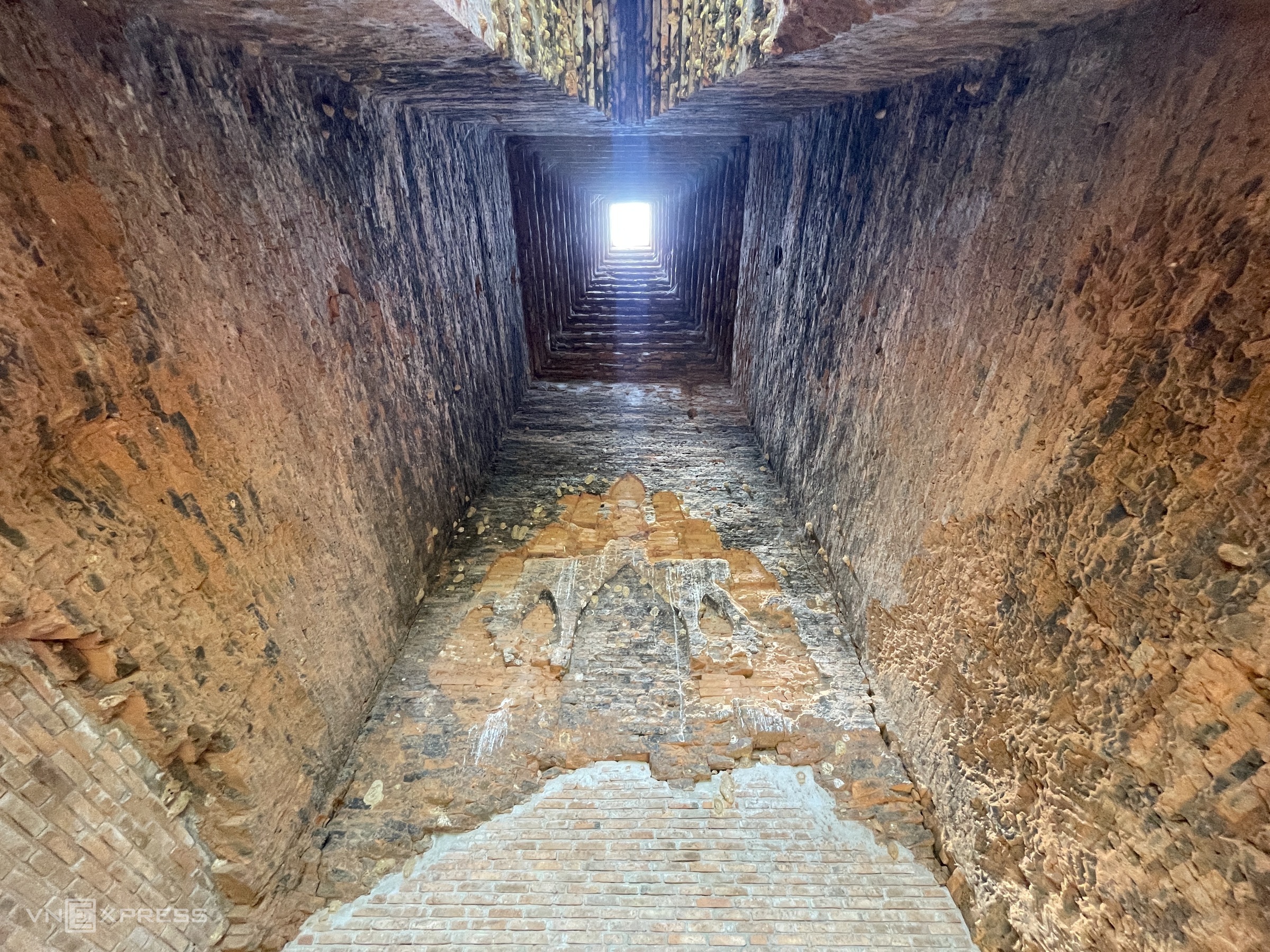 The east entrance of Phu Loc Tower. Inside, the tower is damp, the brick walls are mottled and mossy. Bat droppings create a foul odor, and decomposing animal carcasses are present.