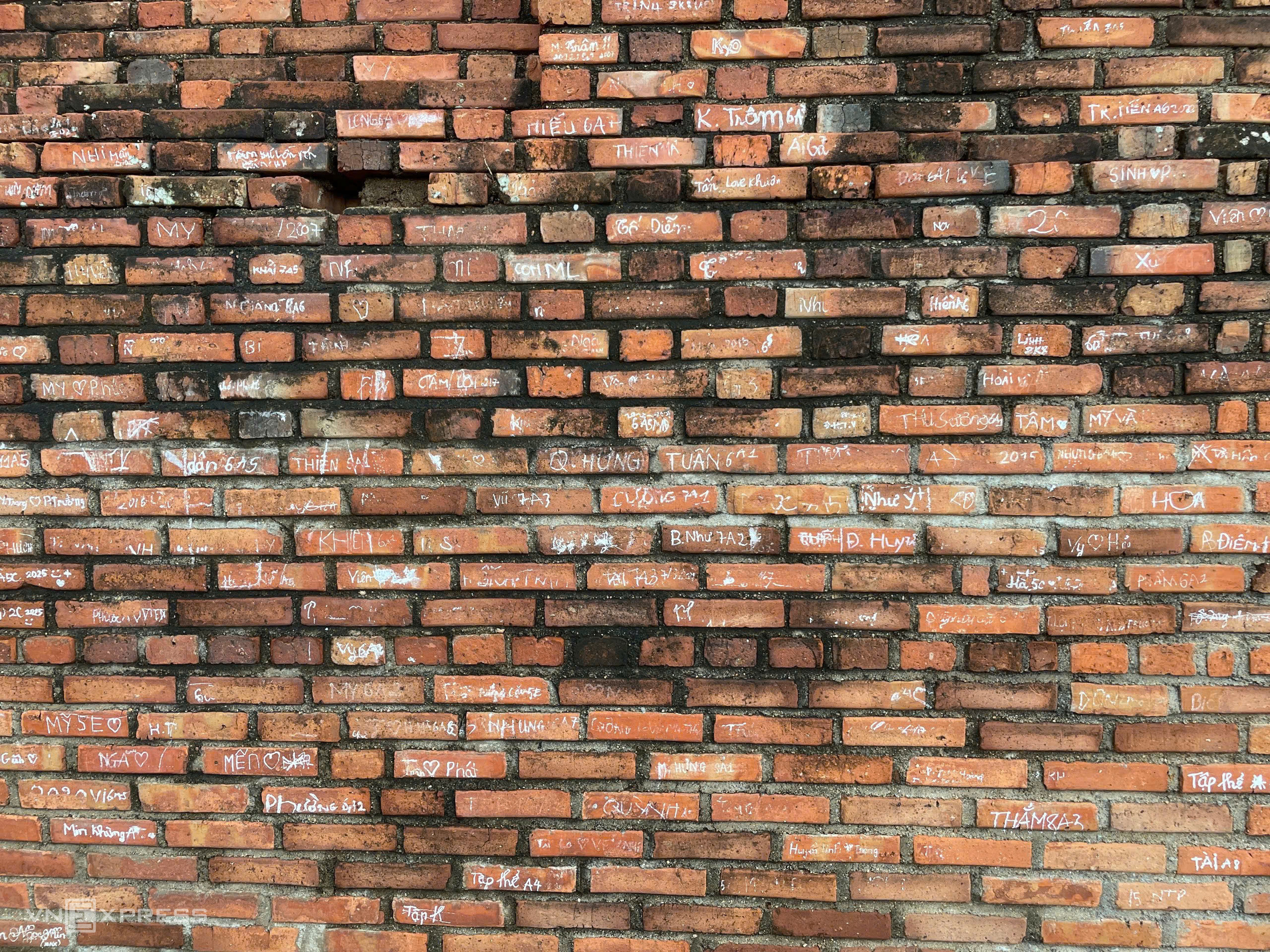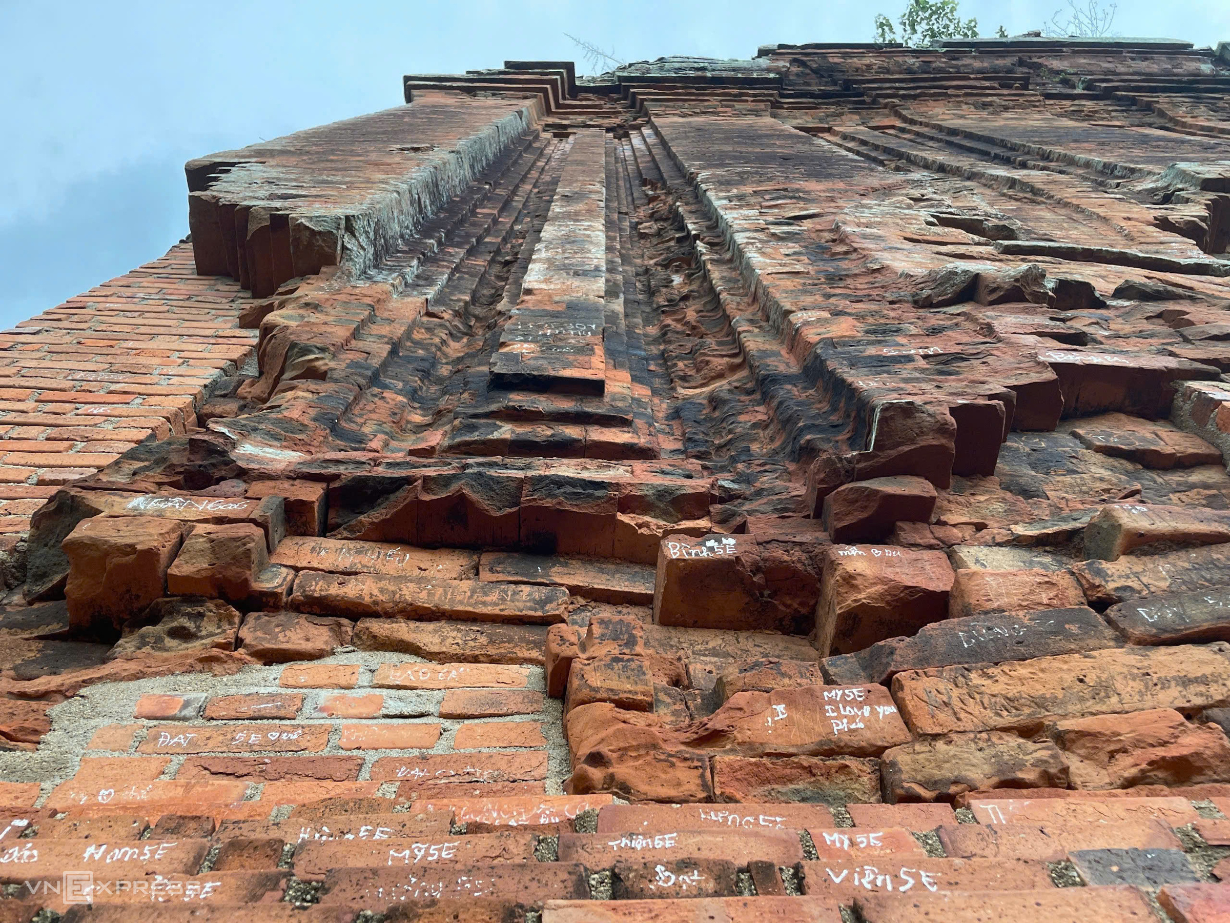 Old and new brick walls of Phu Loc Tower are covered in graffiti and carvings. Even bricks 2-3 meters high are defaced. |