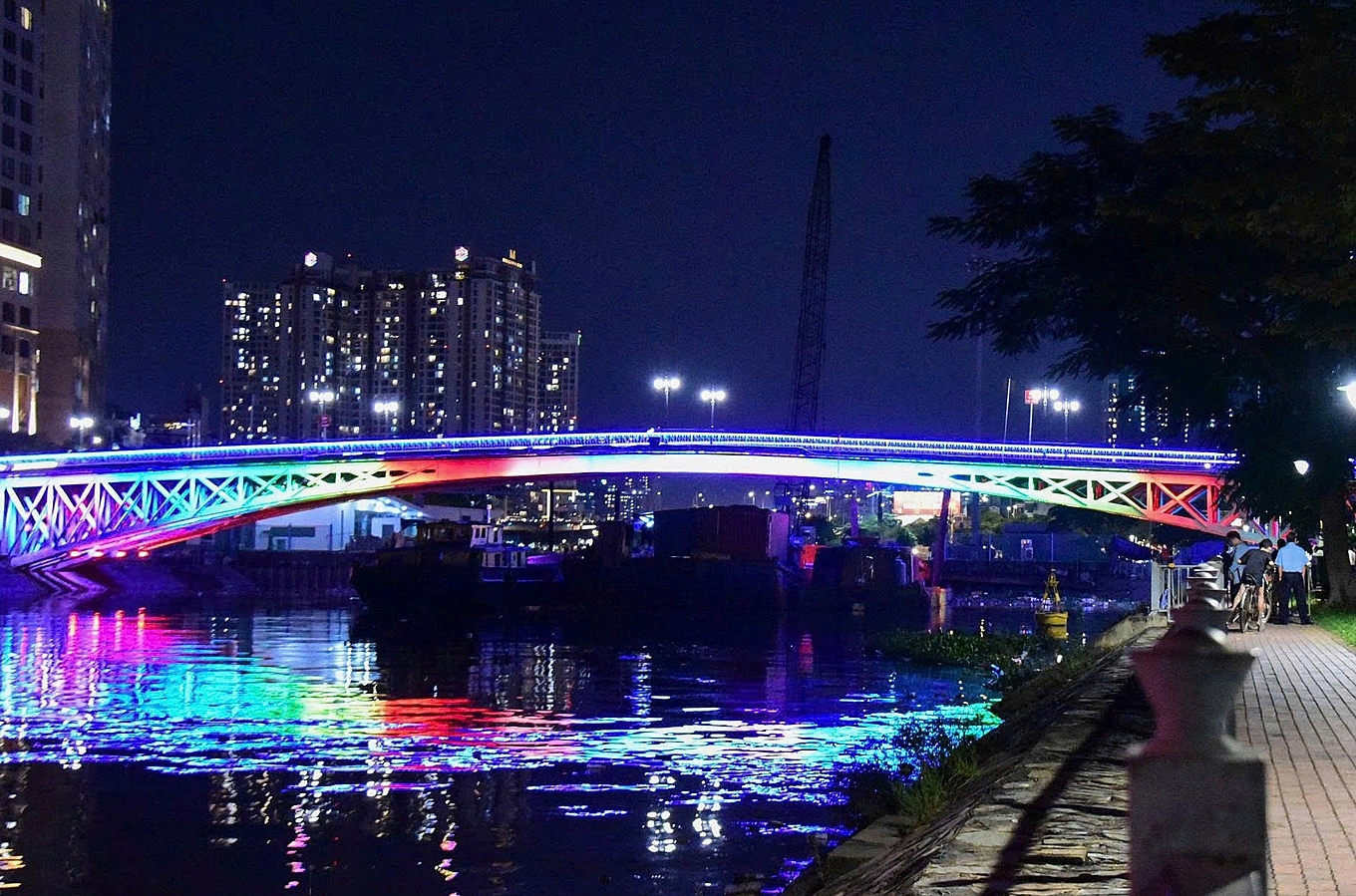 Specifically, Mong Bridge, spanning the Ben Nghe Canal (connecting former districts 1 and 4), features 414 LED lights, artistic lighting strips, and 12 decorative poles. The City Children's House also received 550 LED lights, artistic lighting strips, and 64 decorative poles. Several other structures have similar main components installed.