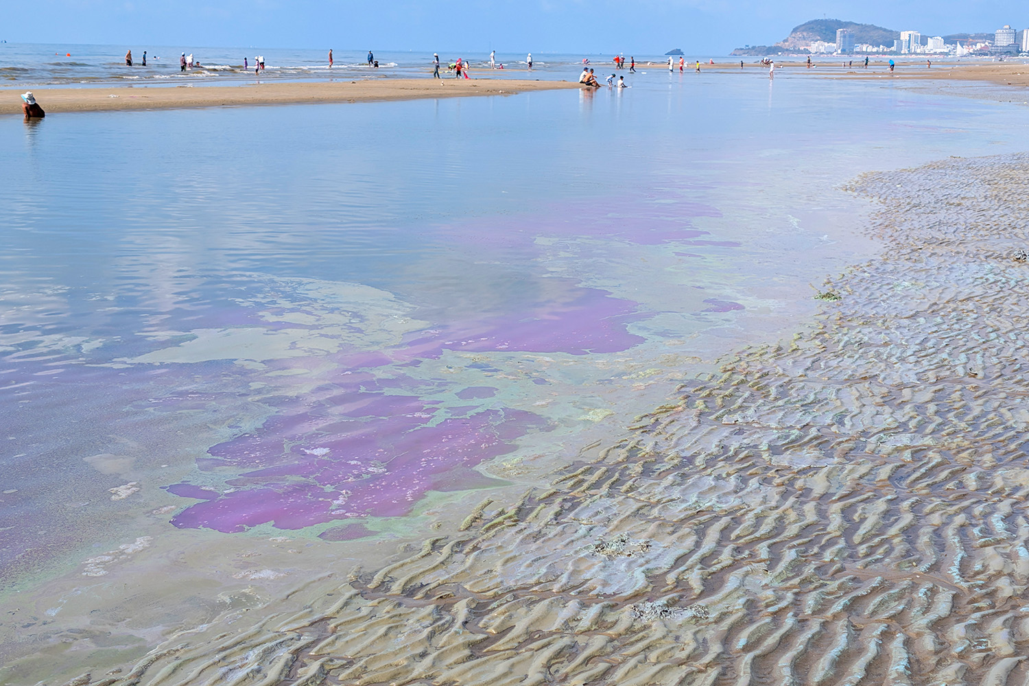 When the tide recedes, purple and blue water scum appears. *Photo: Truong Ha*.