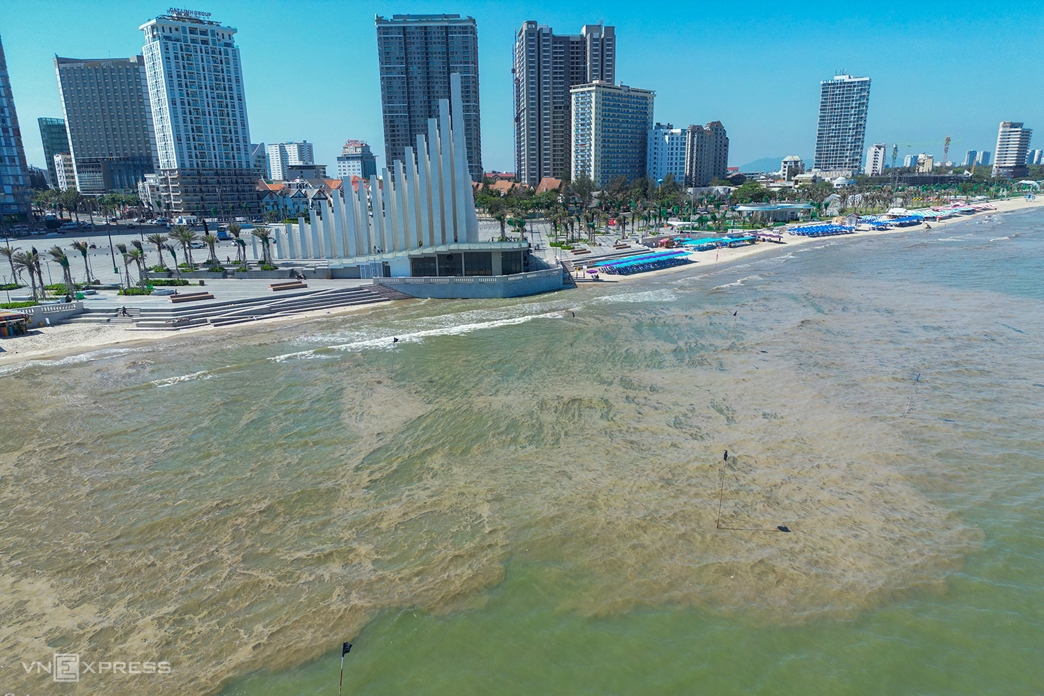 On the afternoon of 4/4, the water about 10-50 m from the shore changed color. Scum appeared, extending for nearly 10 km and reaching the Chi Linh beach area. Patches of silt-colored scum floated on the surface, contrasting with the sea's blue.