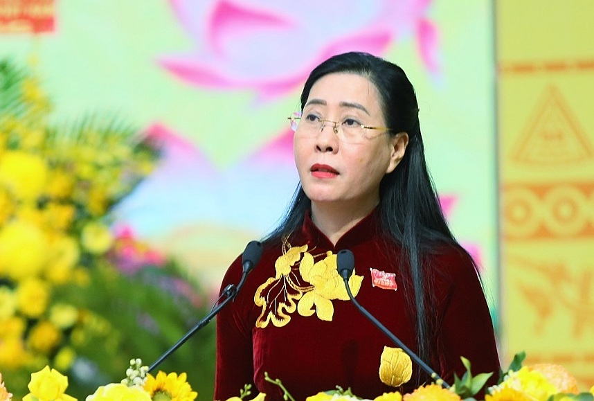 Bui Thi Quynh Van speaking at the Quang Ngai provincial party congress on the morning of 11/9. Photo: Pham Linh