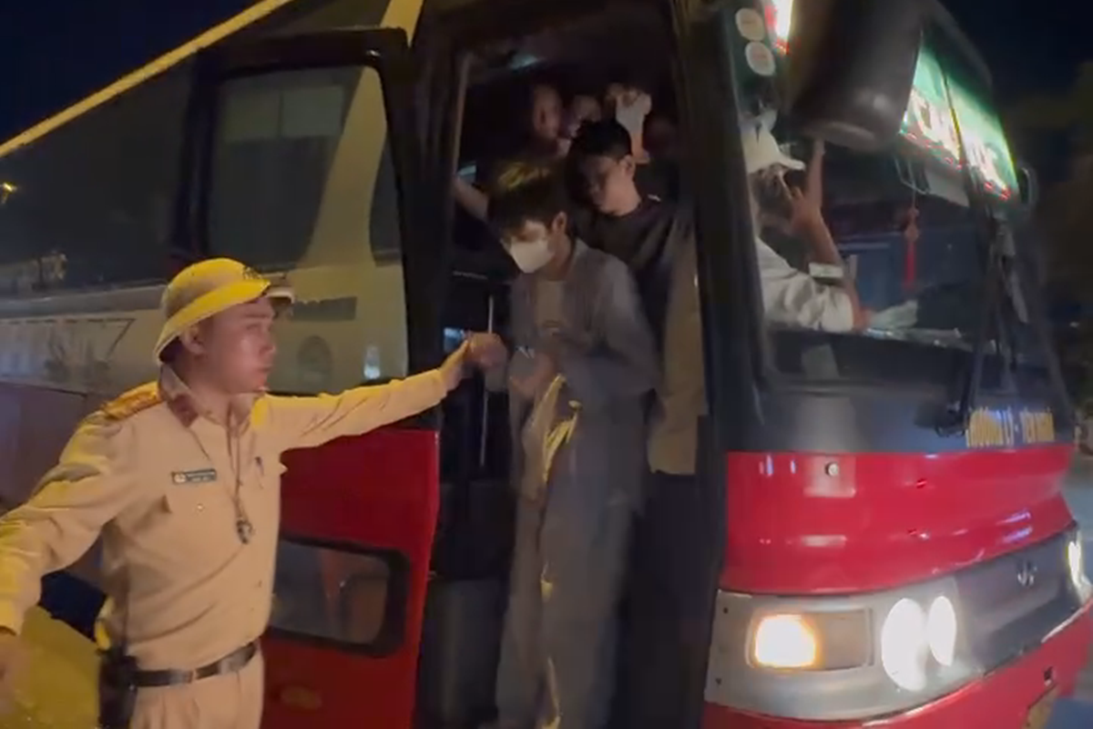 Traffic police inspect the overloaded bus. Photo: Xuan Hoa
