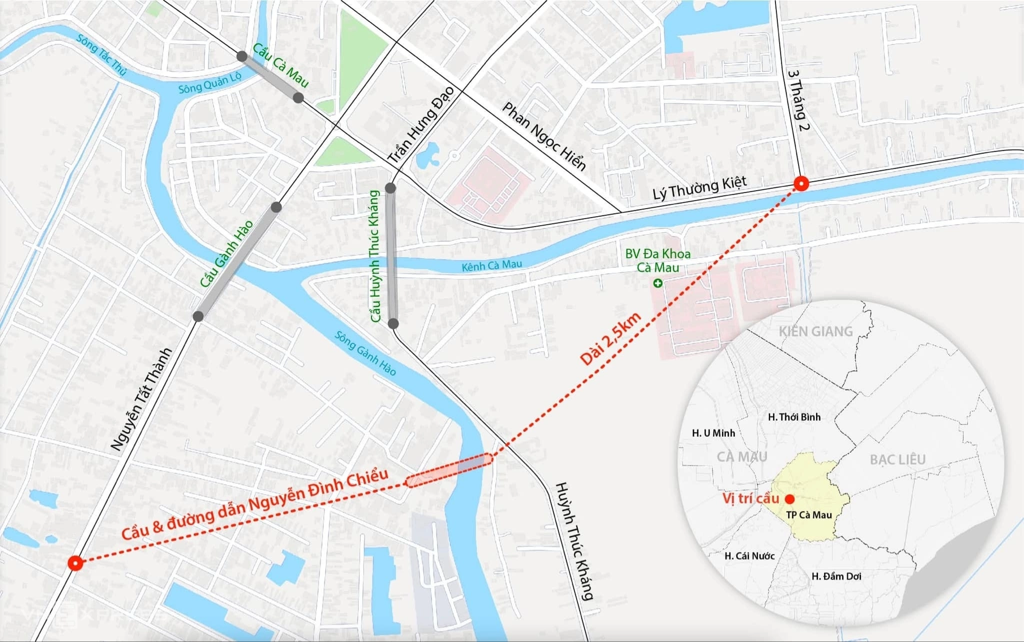 The project's starting point is National Highway 1 (Nguyen Tat Thanh street, Ly Van Lam ward), with its end connecting to the Ca Mau - Dam Doi road (extended February 3rd route). The project is expected to be completed in 2028.