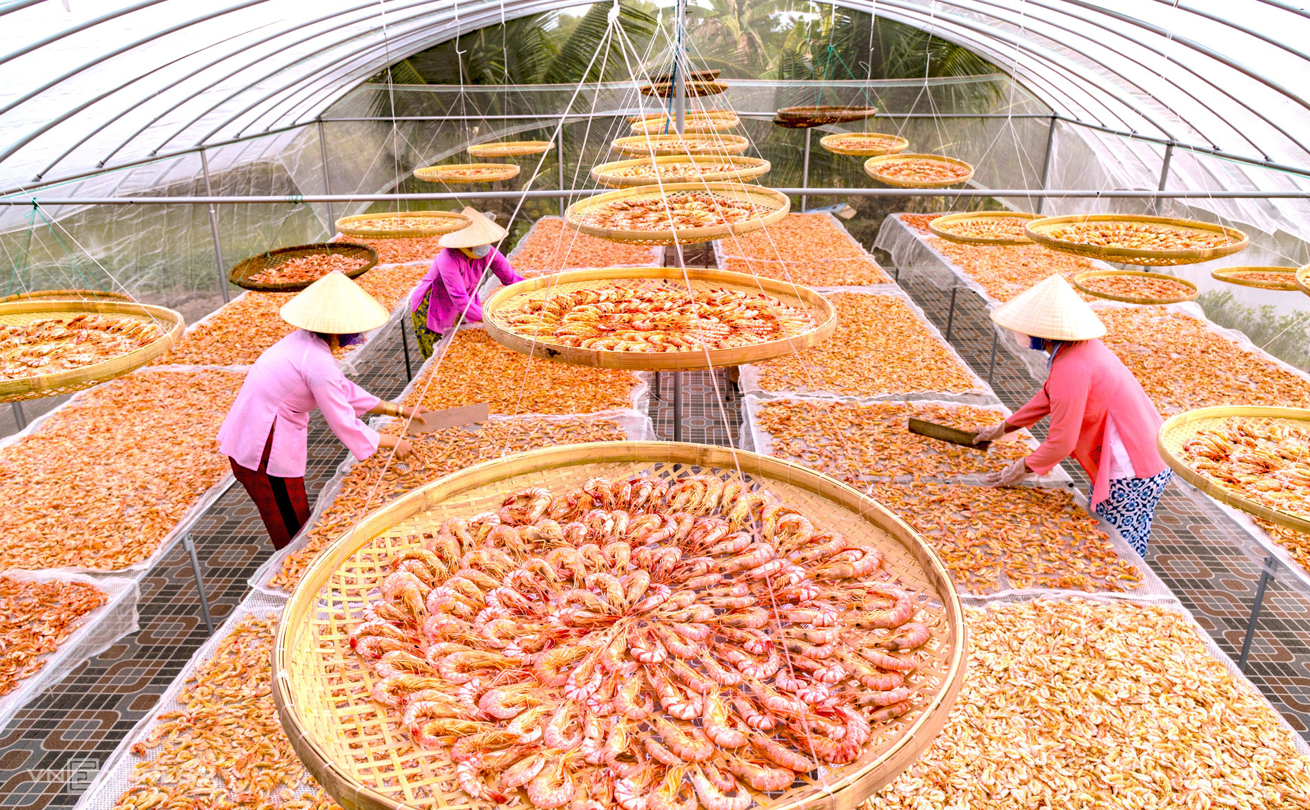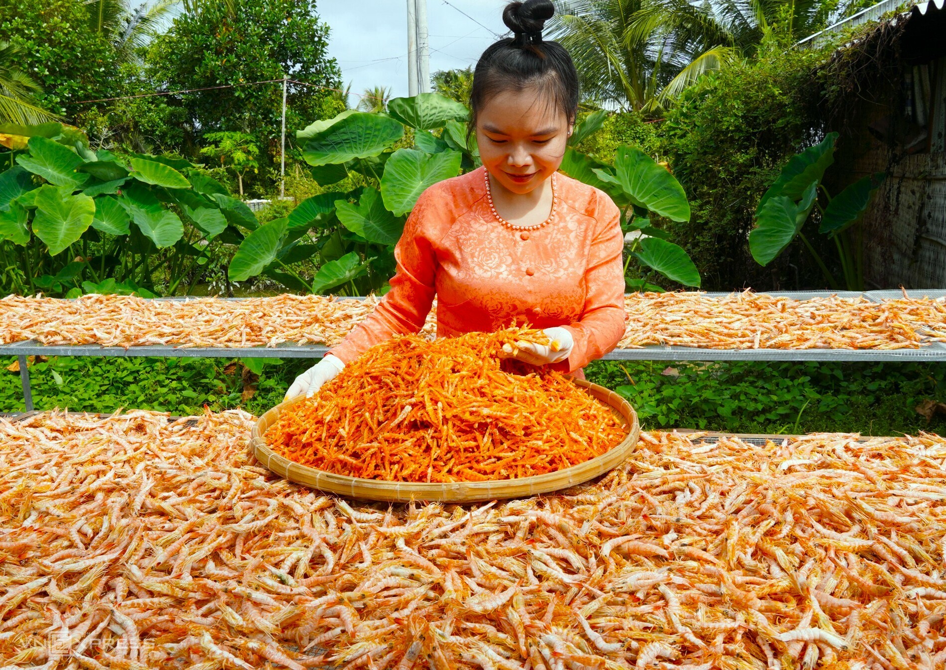 The shrimp are boiled, dried, flattened, peeled, and sun-dried. Earth dried shrimp comes in two types, peeled and unpeeled, currently selling for about 1,5–2,2 million VND per kilogram, approximately 200,000 VND higher than last year.