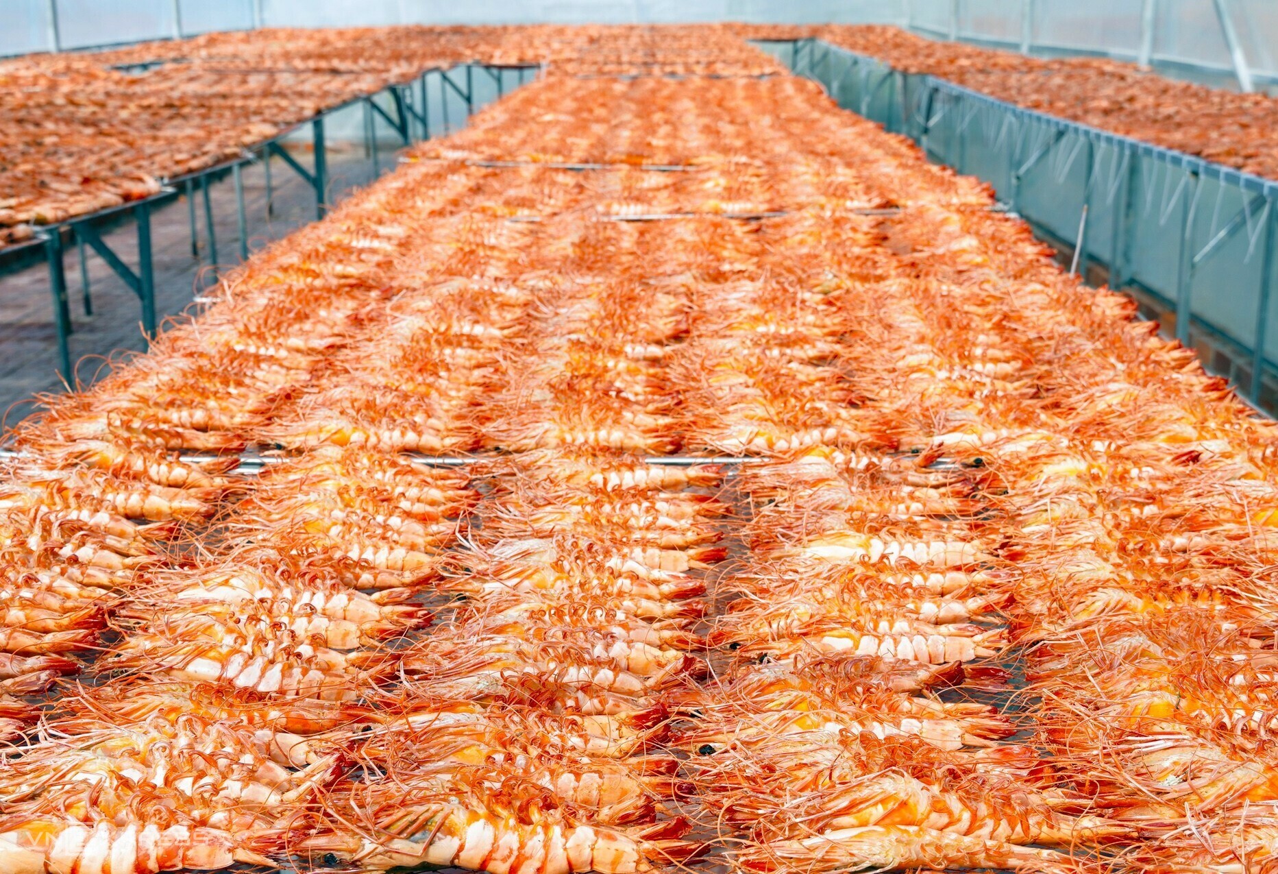 {"caption_all":"Besides earth shrimp, whole-shell tiger prawn dried shrimp is a popular item for Tet. The product has an appealing appearance, often used as gifts. The shrimp have thick meat and are sun-dried extensively after boiling to achieve optimal dryness, an even red color, chewiness, and natural aroma. Tiger prawn dried shrimp is packaged in various ways, priced at 900,000–1,9 million VND per kilogram. The product can be stored at room temperature for about 10 days, or for three months if frozen.","caption_items":"["",""]"}