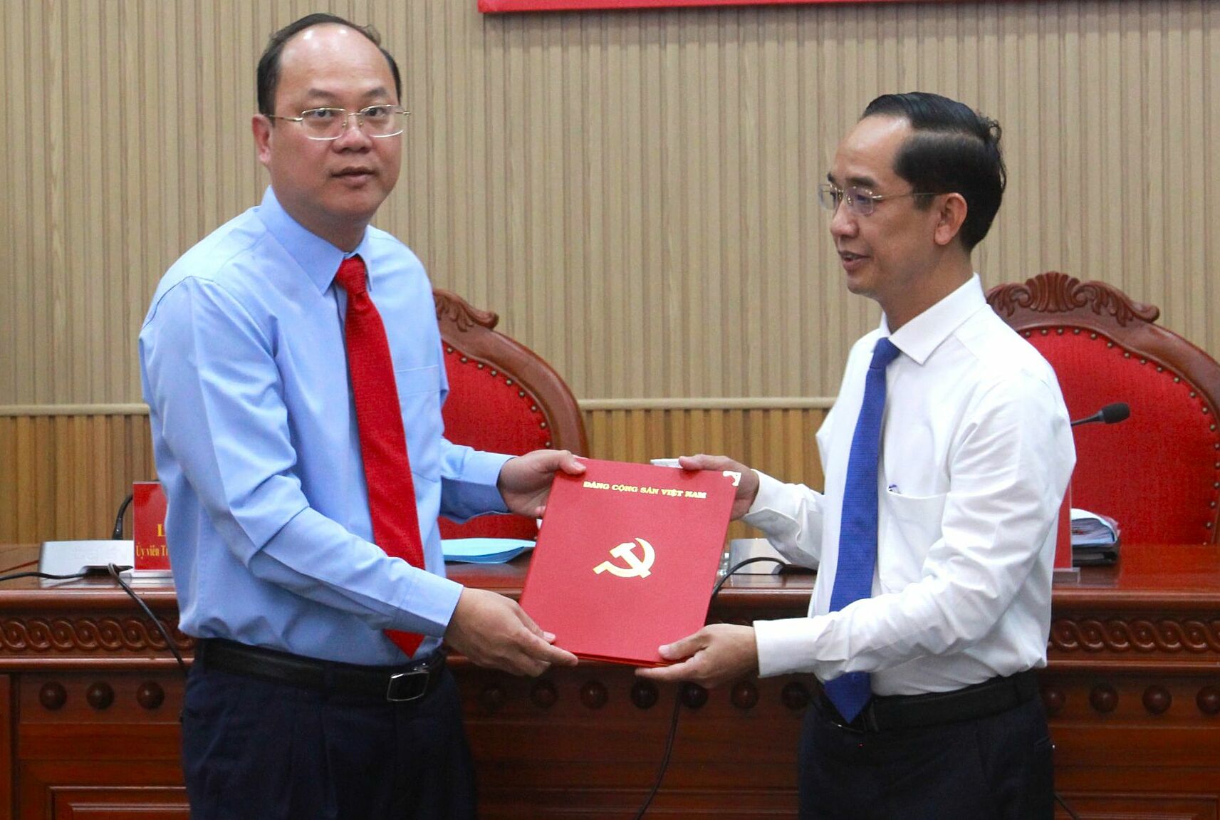 Ca Mau provincial party committee secretary Nguyen Ho Hai (left) presents the decision to Ho Thanh Thuy. Photo: An Minh |