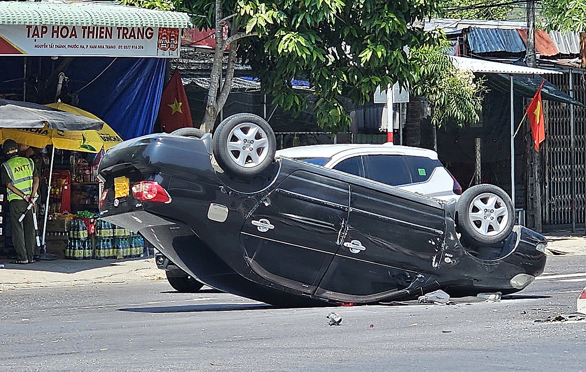 Around 13:00, the car was traveling from Nha Trang towards Cam Ranh international airport. Near Diamond Bay resort, Nam Nha Trang ward, the car suddenly veered into the median strip, flipping onto the opposite lane, with smoke rising from the cabin.